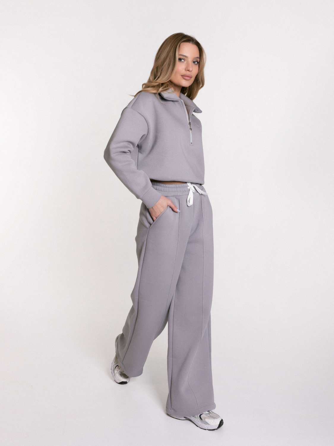 Женские брюки выполнены из полотна с начесом. Модель с декоративной отстрочкой в виде стрелок спереди. Удобный пояс на резинке со шнуром обеспечивает идеальную посадку. Практичные боковые карманы. Универсальная модель для создания стильных повседневных образов.