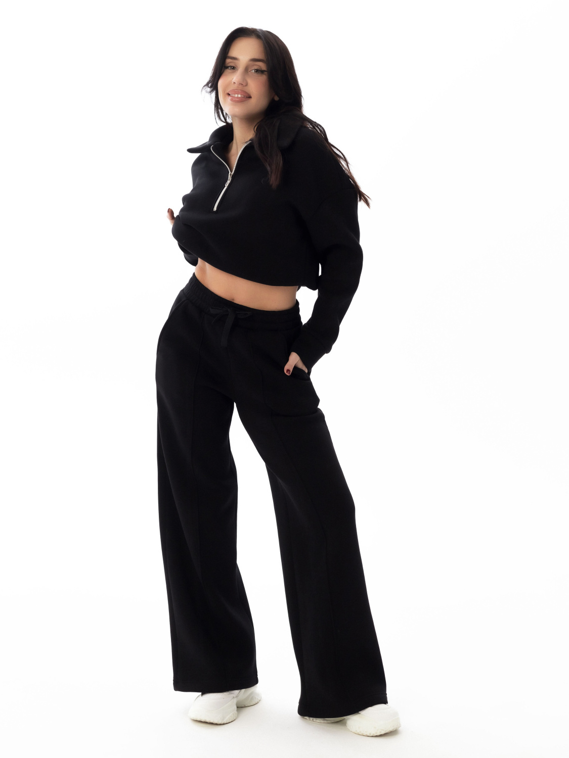 Женские брюки выполнены из полотна с начесом. Модель с декоративной отстрочкой в виде стрелок спереди. Удобный пояс на резинке со шнуром обеспечивает идеальную посадку. Практичные боковые карманы. Универсальная модель для создания стильных повседневных образов.