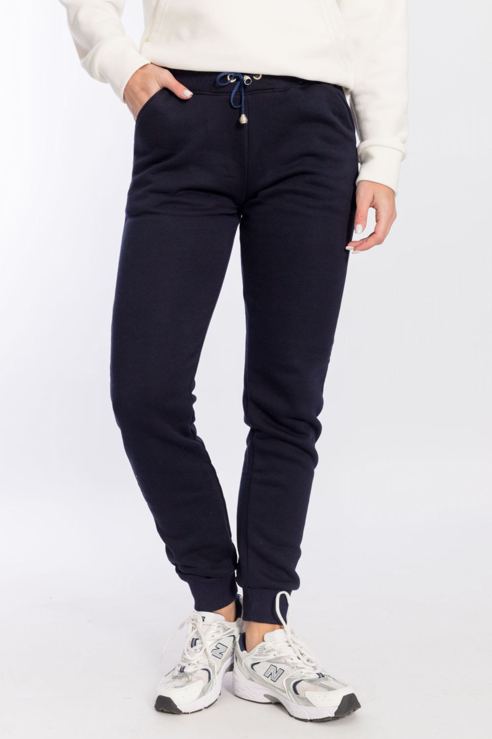 Брюки женские из полотна с начёсом. Низ брюк на манжетах, пояс на резине со шнуром, по бокам расположены карманы.