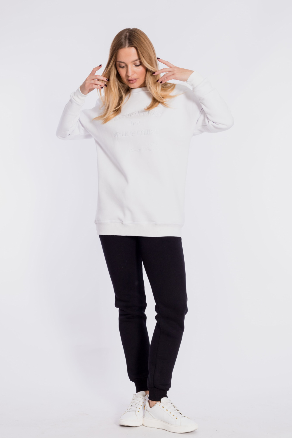 Брюки женские из полотна с начёсом. Низ брюк на манжетах, пояс на резине со шнуром, по бокам расположены карманы.