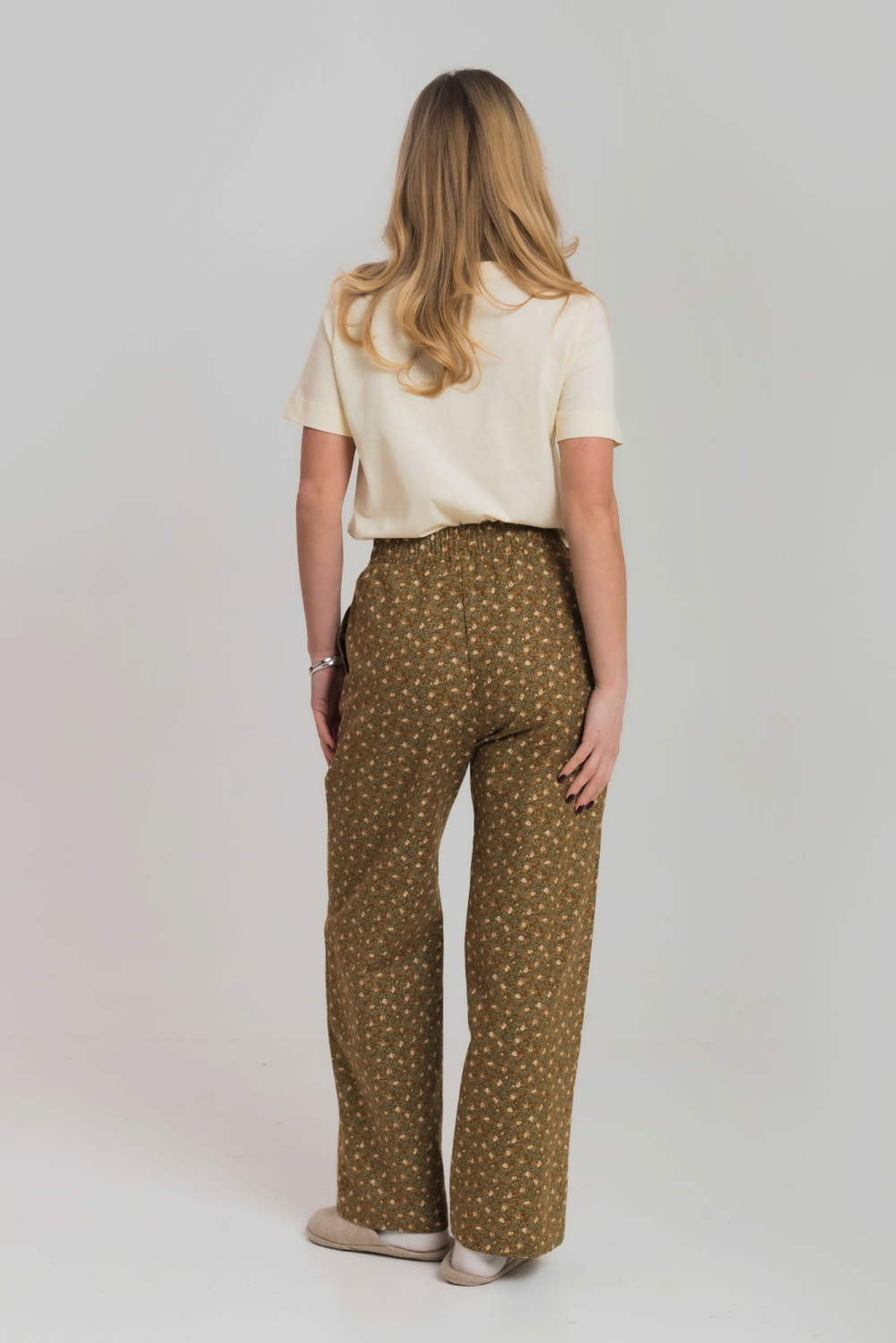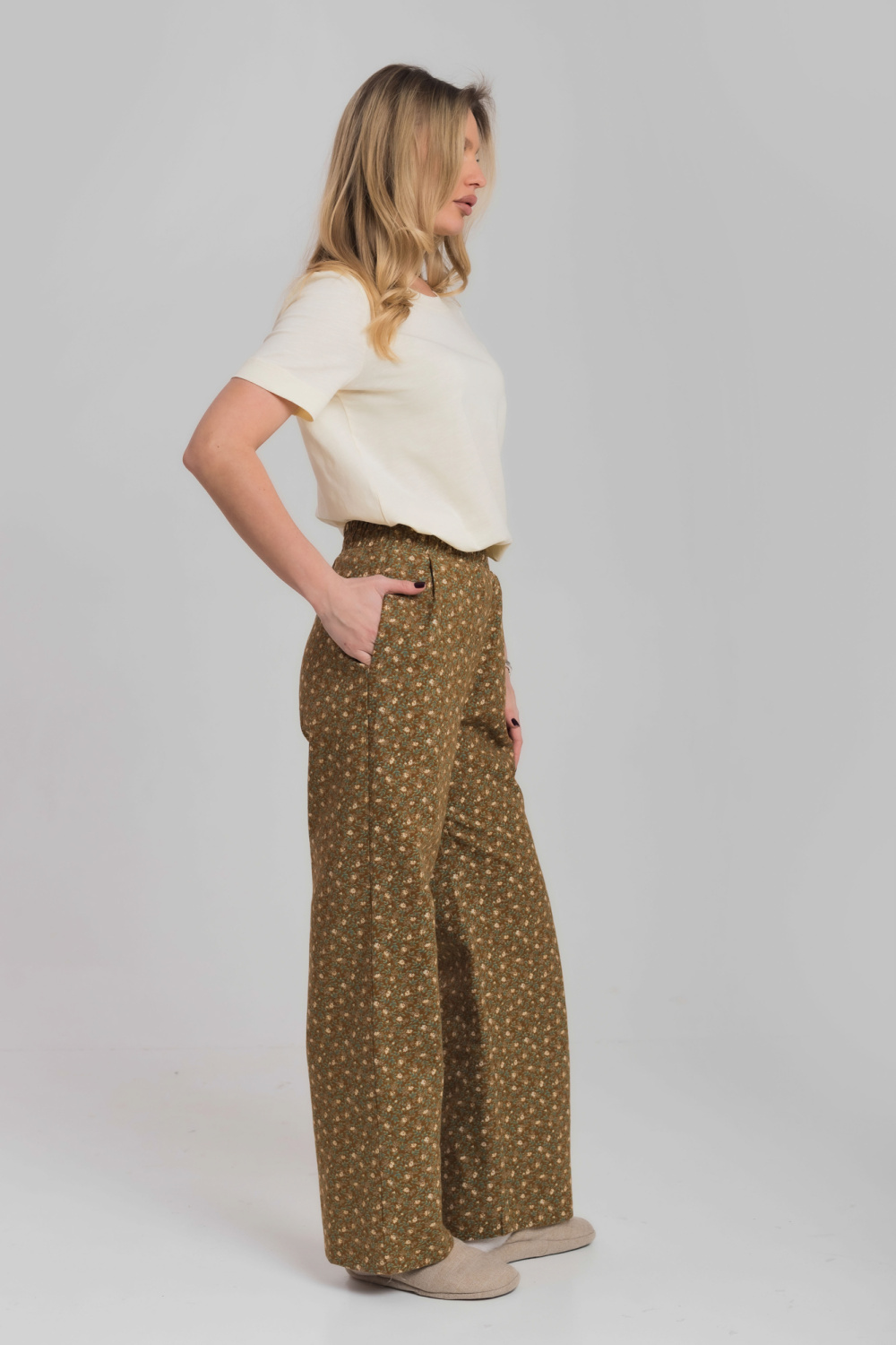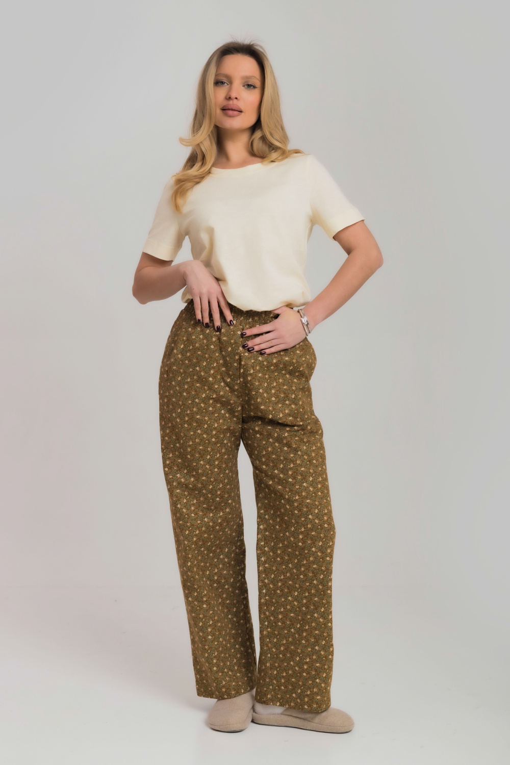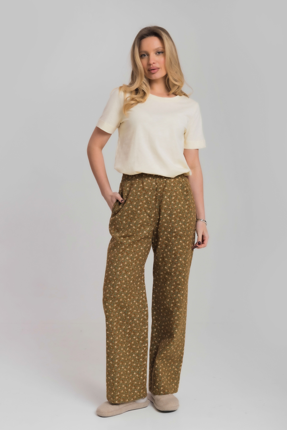 Брюки свободного кроя выполнены из мягкого рубашечного шерона на хлопковой основе. Материал легкий, приятный к телу и хорошо дышит. Пояс на комфортной резинке обеспечивает удобную посадку, а боковые карманы добавляют функциональности. Идеальный вариант для домашнего отдыха и повседневного комфорта.