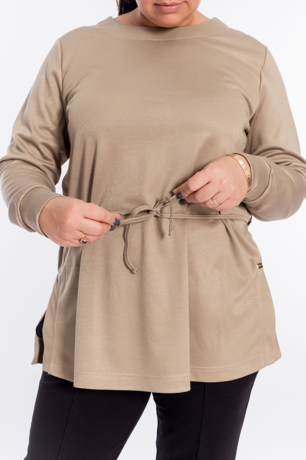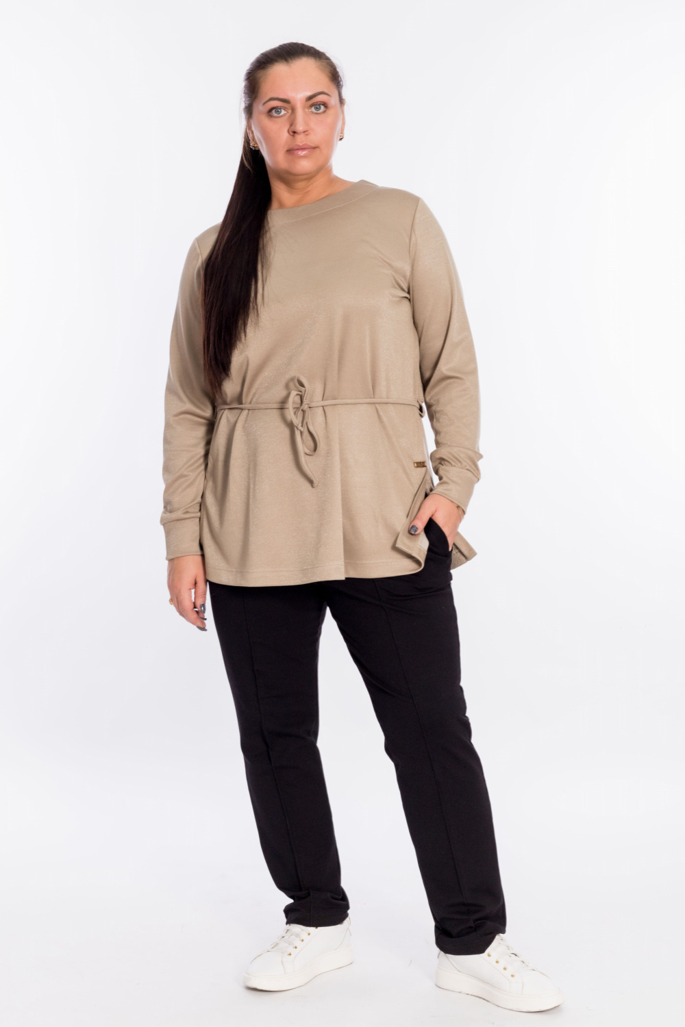 Джемпер выполнен из полотна "академик" с люрексом. С длинным втачным рукавом. Сзади по талии кулиска для шнура. По бокам разрезы с втачными планками.