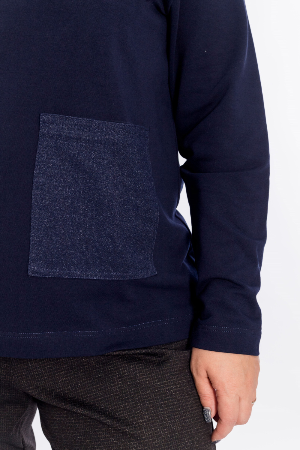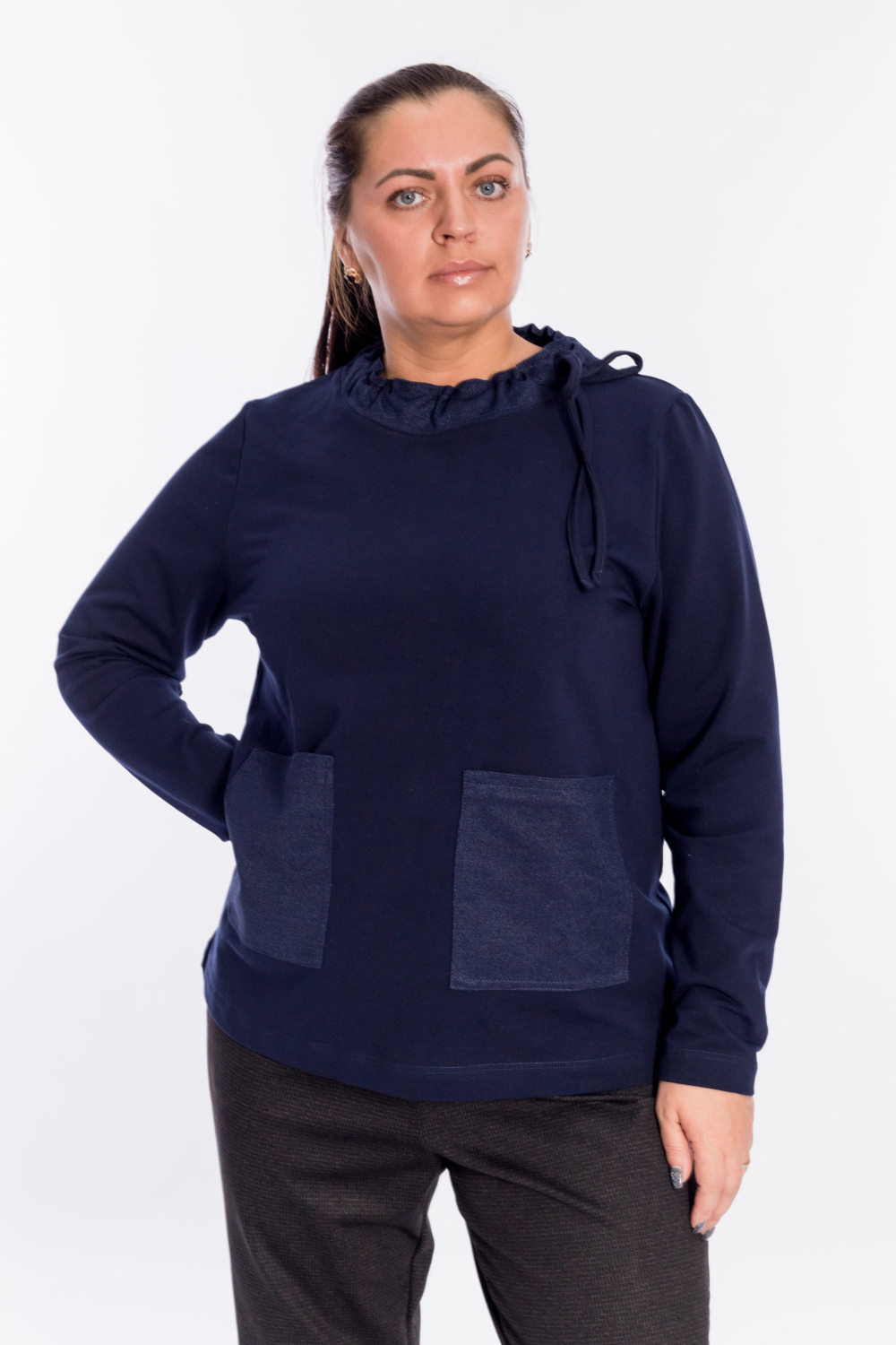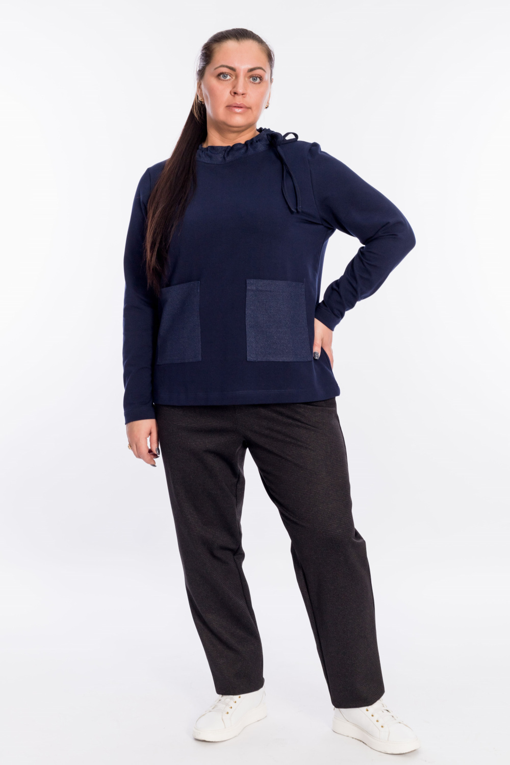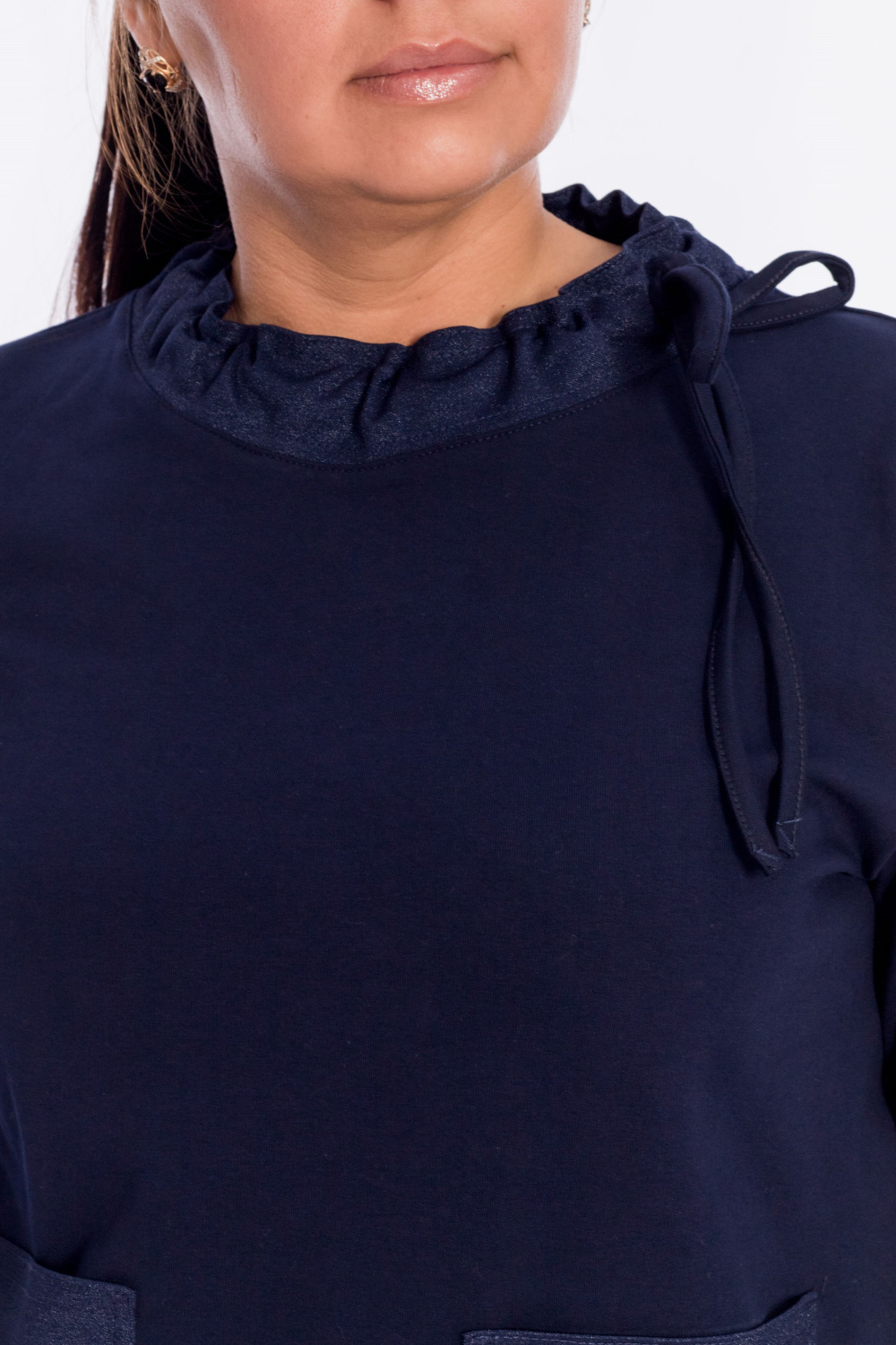 Джемпер выполнен из футер петли с лайкрой. Спереди расположены накладные карманы. Детали воротника, карманов, бейки-завязки выполнены из отделочного полотна с люрексом.