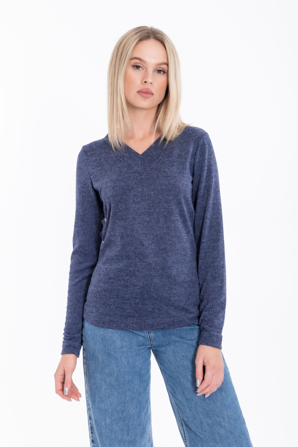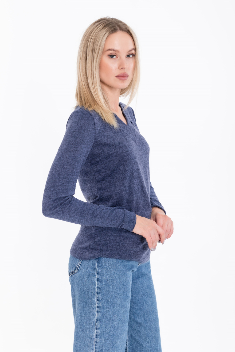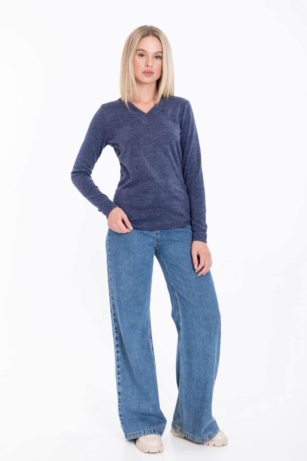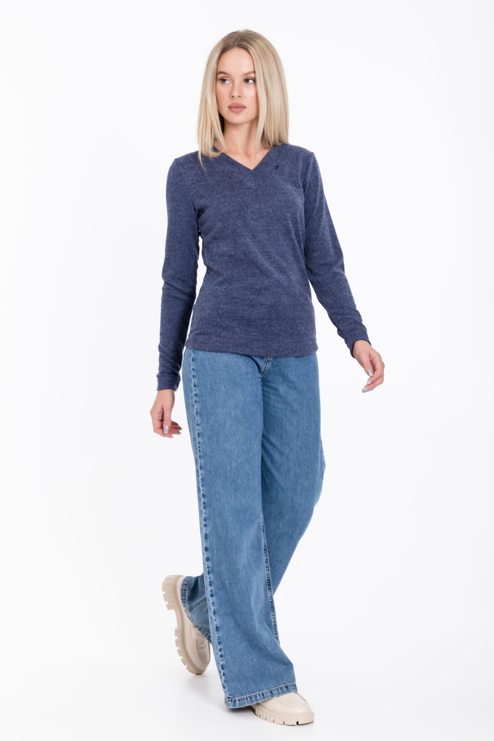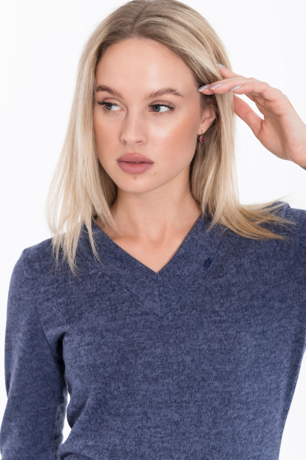 Джемпер выполнен из вязаного полотна ангорка в цвете индиго. Силуэт прилегающий. В шов планки V-образного выреза горловины вшит декоративный флажок.