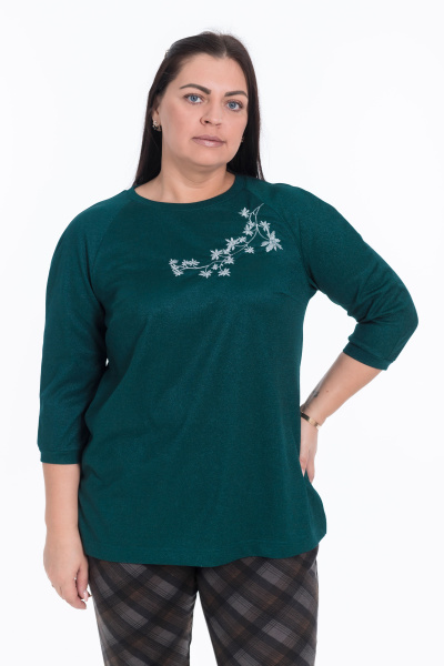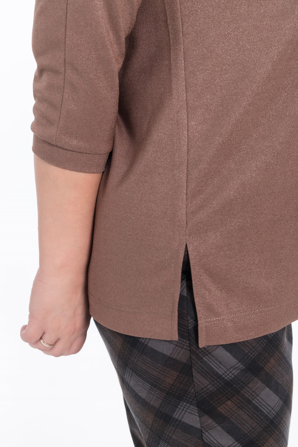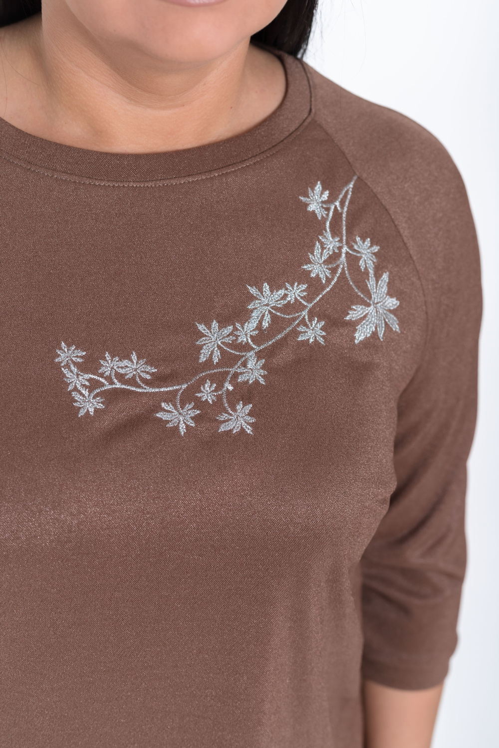 Коричневый джемпер свободного кроя с рукавами реглан и выточками по бокам — отличный выбор для создания уютного образа. Длина рукава 3/4 и круглый вырез горловины обеспечивают удобство, а вышивка на груди и материал с люрексом придают изысканность.