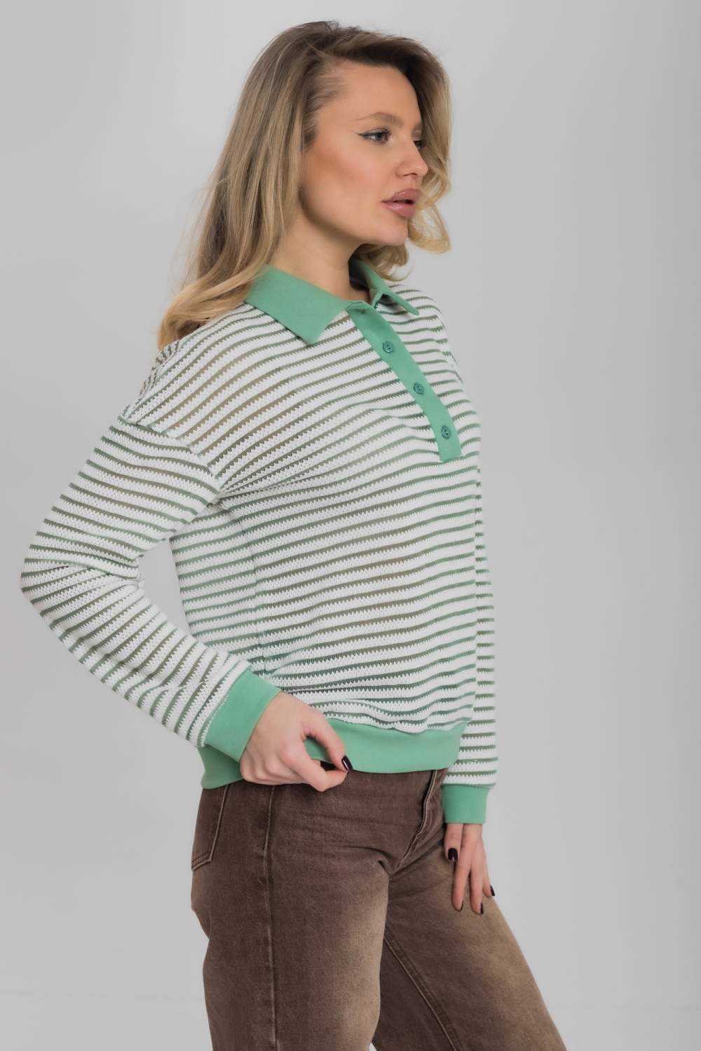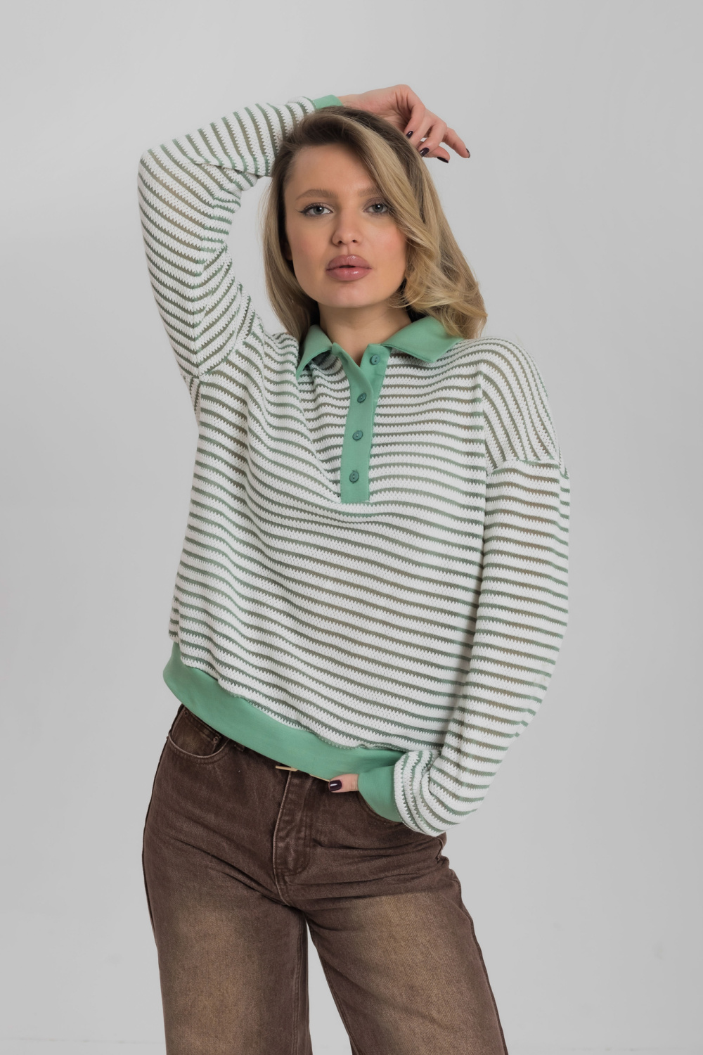 Джемпер-поло из жаккарда пенье крученого в полоску с отделочными деталями из однотонной рибаны: притачной пояс,  манжеты, воротники и планки. Джемпер объемный со спущенной проймой.
