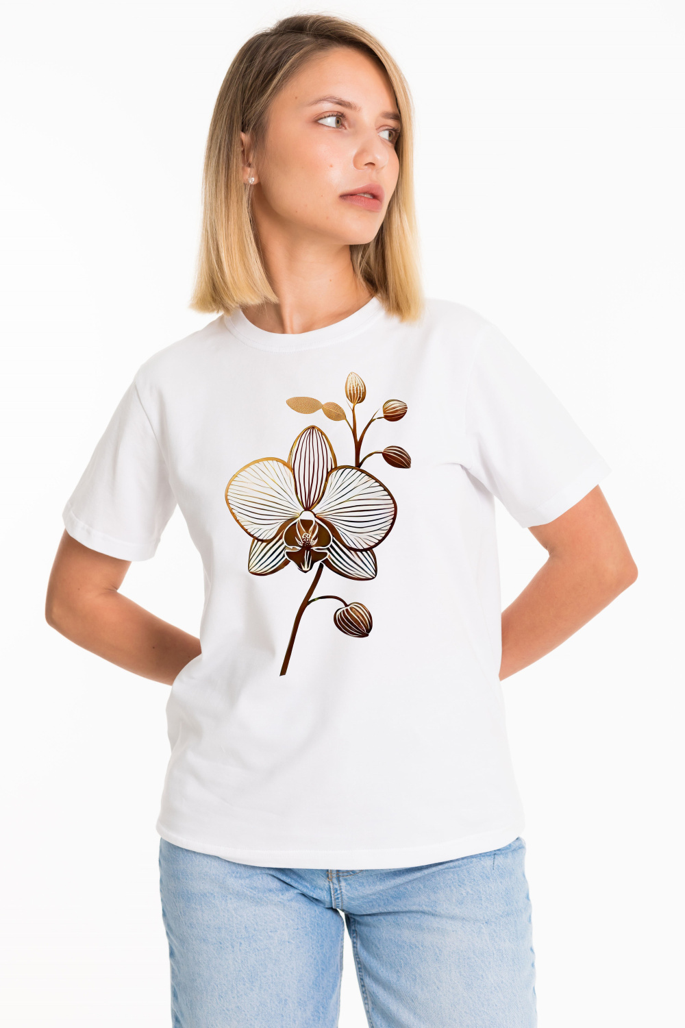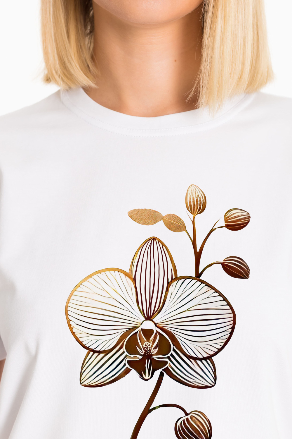 Футболка из однотонной кулирки с лайкрой. С коротким втачным рукавом и притачной планкой по горловине. Спереди нанесён принт.