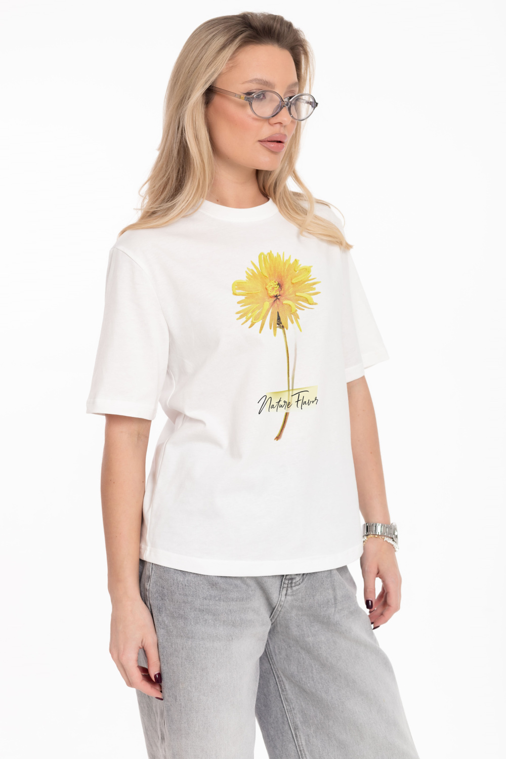 Футболка из однотонной кулирки, 100% хлопок. С коротким втачным рукавом и притачной планкой по горловине. Спереди нанесён принт.