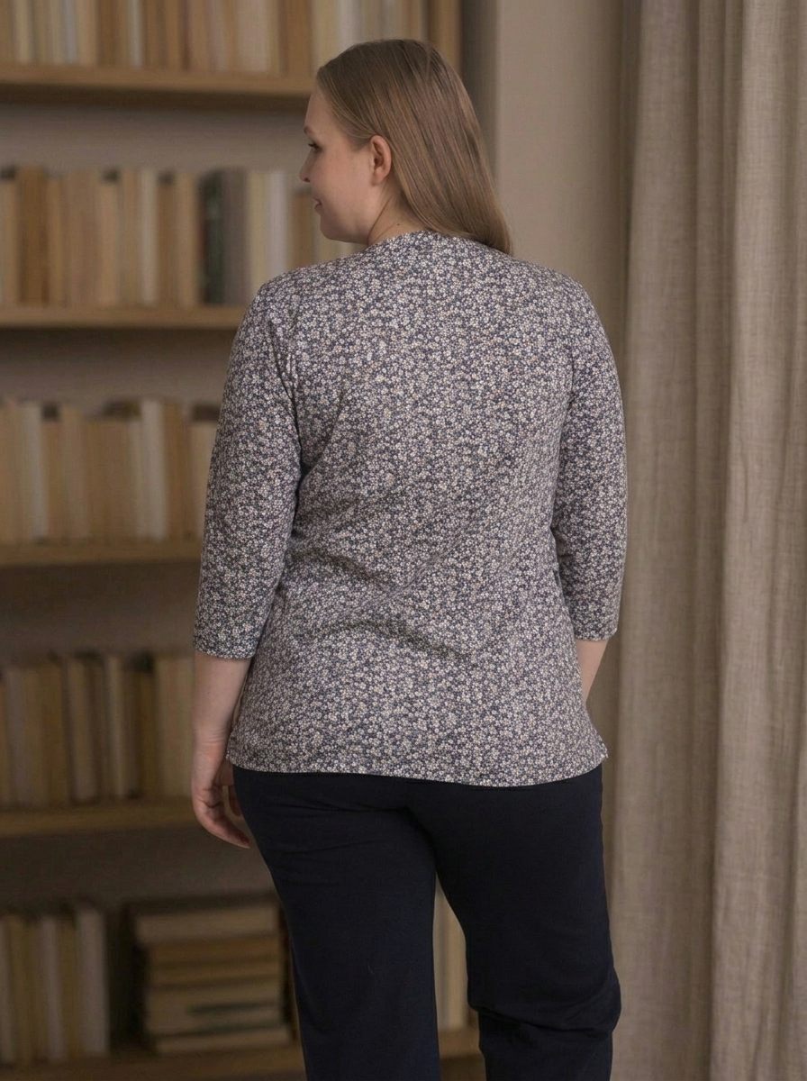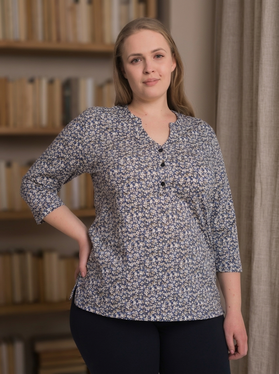 Женская футболка из 100%-ного хлопка с узором в мелкий цветочек — отличный выбор для повседневной носки. Она изготовлена из мягкой и приятной к телу ткани, которая обеспечивает комфорт в течение всего дня. Рукав 3/4 и фигурный вырез горловины придают изделию стильный вид. Футболка застёгивается на три пуговицы, а разрезы в боковых швах добавляют ей оригинальности. Эта футболка подойдёт для прогулок, неформальных встреч или отдыха. Её можно сочетать с различными элементами гардероба.