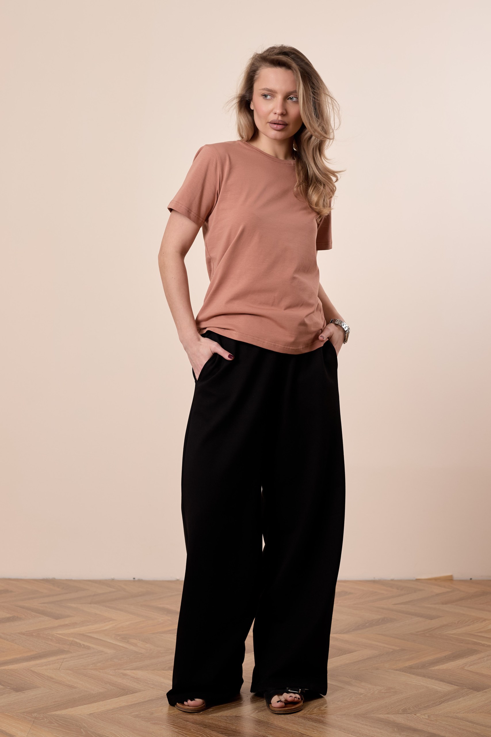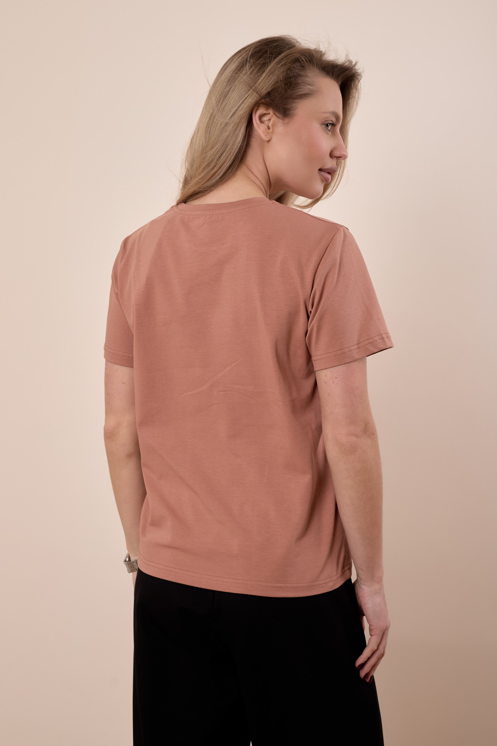 Женская футболка изготовлена из хлопкового полотна с добавлением лайкры, что обеспечивает комфорт и хорошую воздухопроницаемость. Футболка имеет короткий втачной рукав и круглый вырез горловины, что придает ей классический стильный вид. Такая модель светло-коричневого цвета отлично сочетается с джинсами, брюками или юбкой. Изготовленная из натуральной ткани, футболка обеспечит комфорт в течение всего дня.