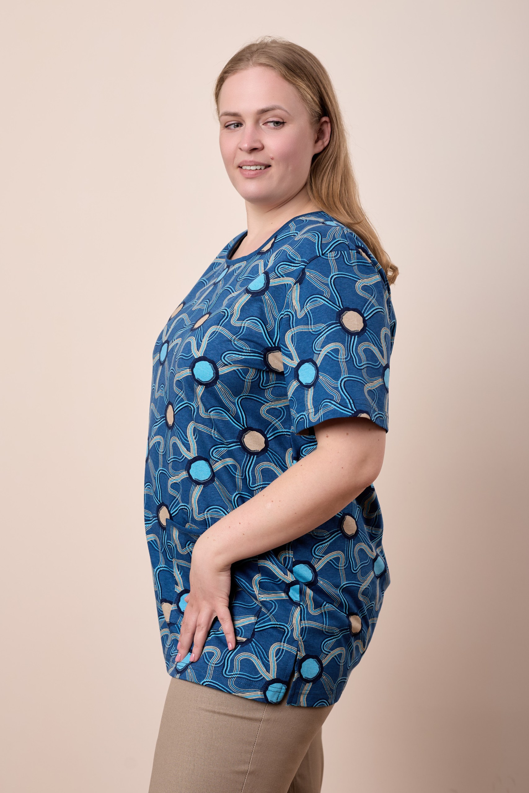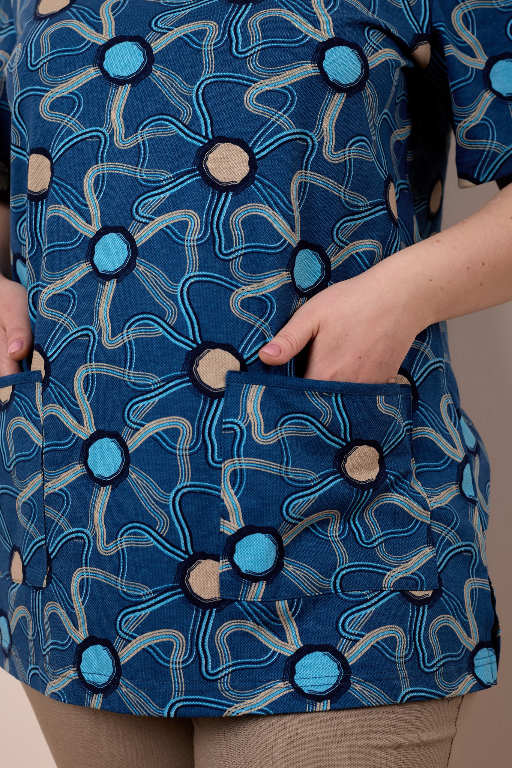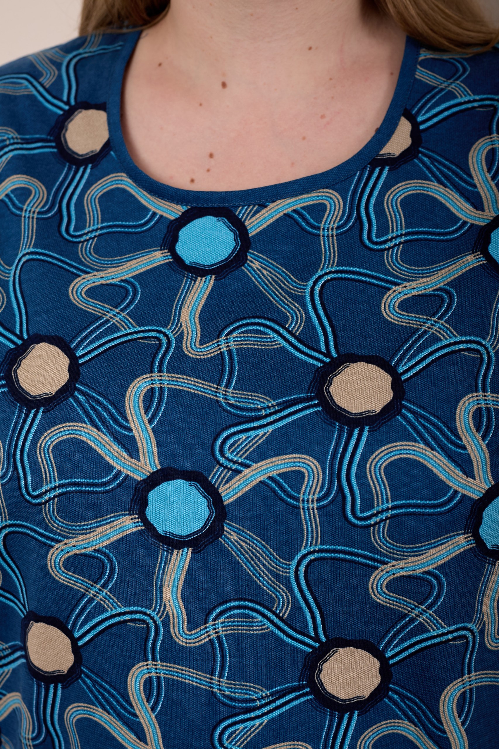 Лаконичная и комфортная футболка из мягкой кулирки — приятная к телу, дышащая и удобная для ежедневной носки. Круглый вырез горловины оформлен аккуратной окантовкой, короткий рукав обеспечивает свободу движений. По бокам расположены практичные накладные карманы с контрастной отделкой, добавляющей модели выразительности. Рисунок на полотне создаёт современный, динамичный образ. Прямой свободный силуэт и оптимальная длина делают эту футболку универсальной и функциональной в любом гардеробе.