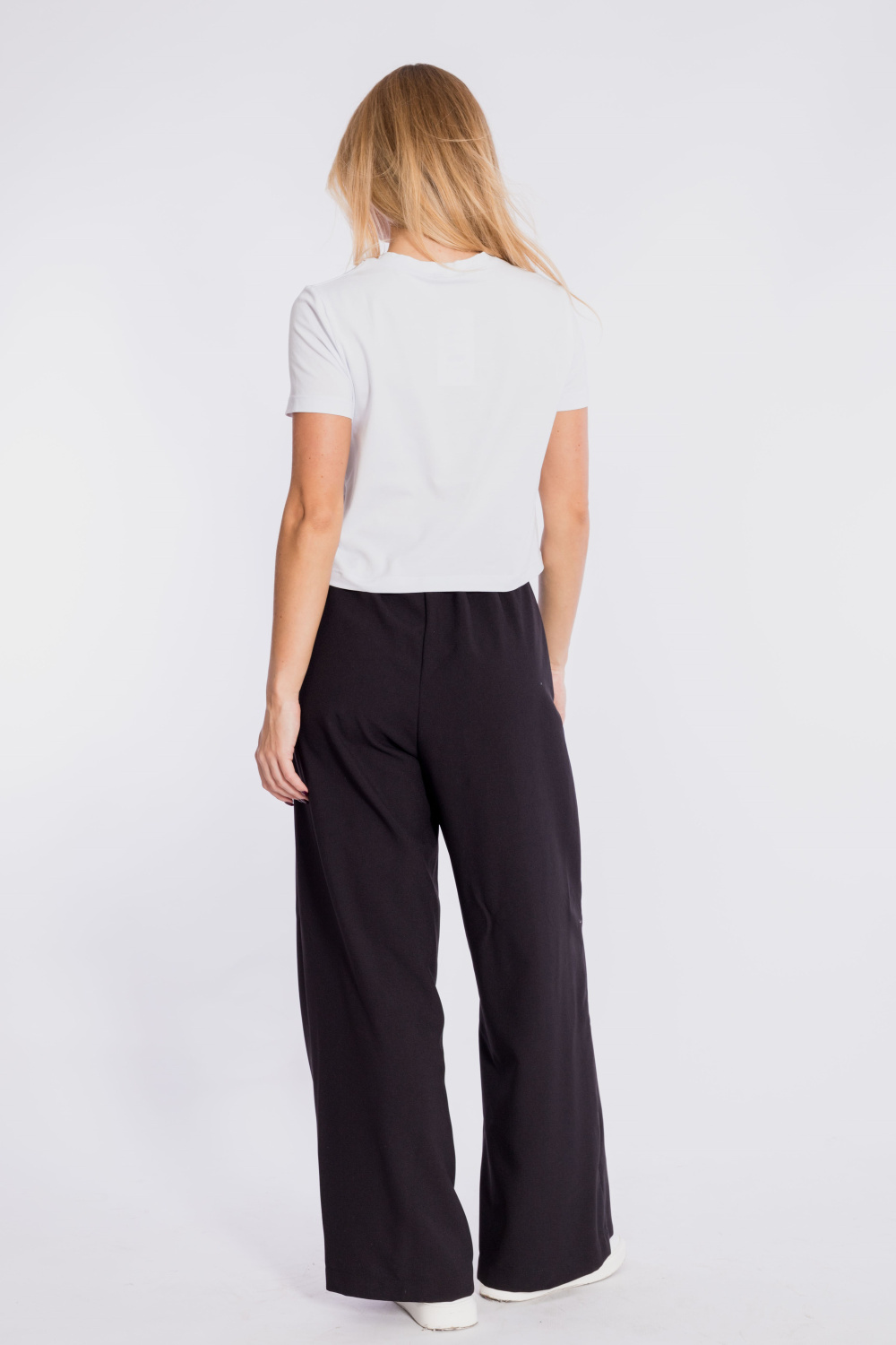 Футболка из однотонной кулирки с лайкрой. Укороченная, прямая, с коротким втачным рукавом. Вырез горловины круглый, обработан планкой.