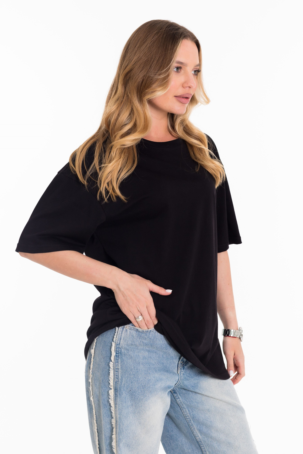 Практичная и комфортная футболка из легкой, дышащей ткани — отличный выбор для повседневного гардероба. Модель из черной кулирки с классическим круглым вырезом и свободным кроем не сковывает движения и обеспечивает комфорт в течение всего дня. Универсальный фасон подходит как мужчинам, так и женщинам. Идеально для отдыха, домашнего использования или неформальных образов. Легко сочетается с джинсами, шортами и спортивной одеждой.