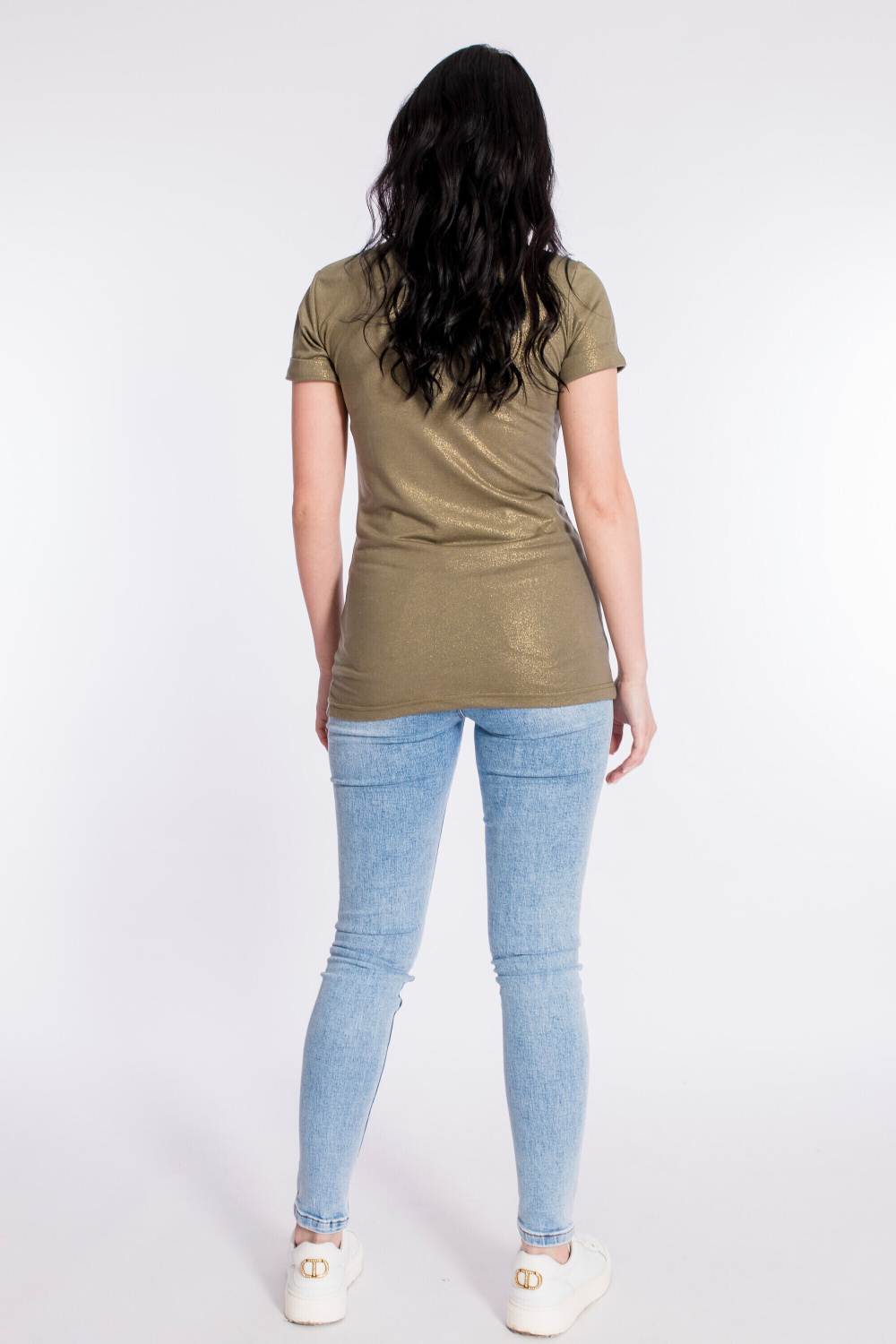 Футболка выполнена из однотонного полотна вискоза с напылением. Силуэт футболки облегающий, короткий рукав с отворотом, горловина имеет круглый вырез.