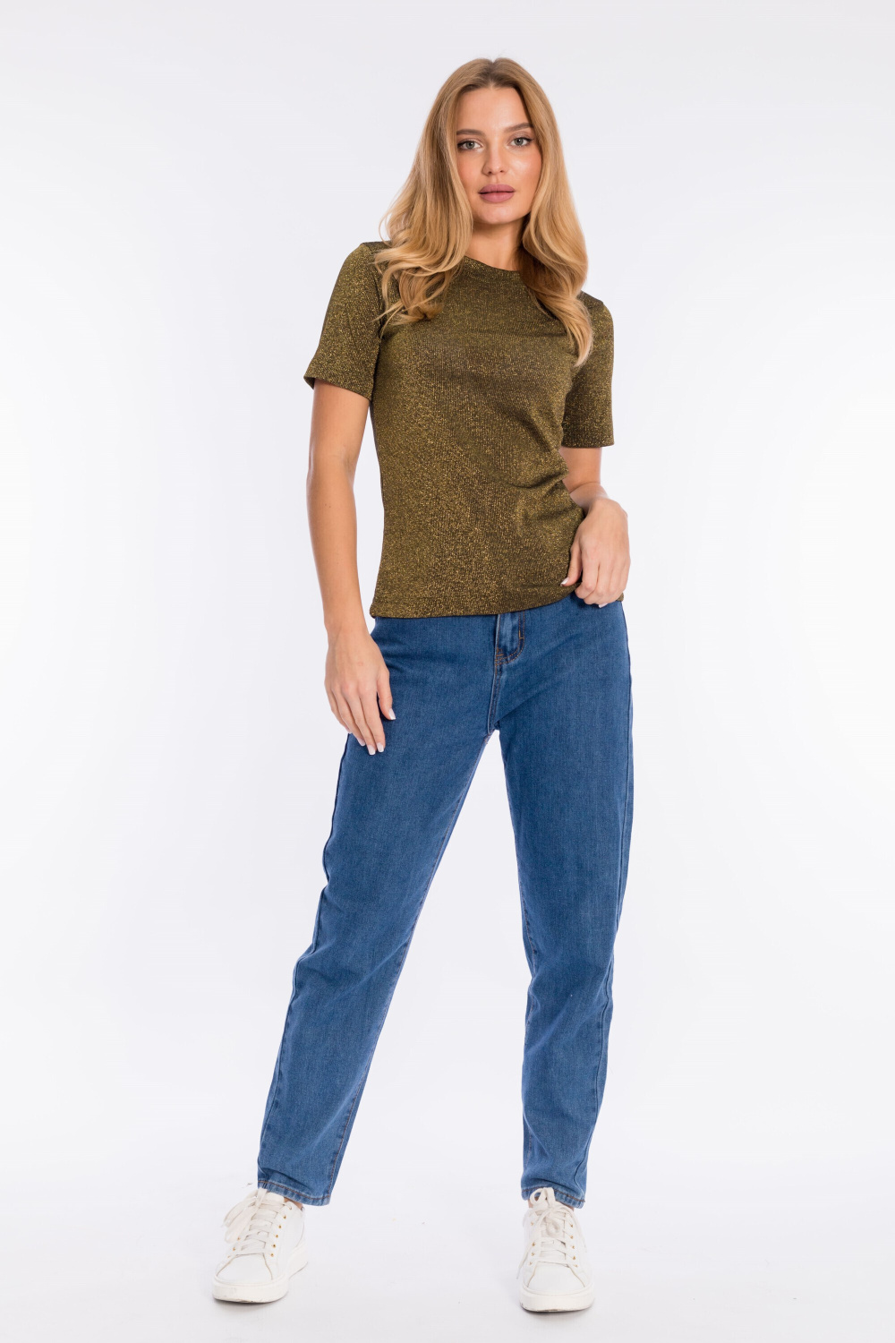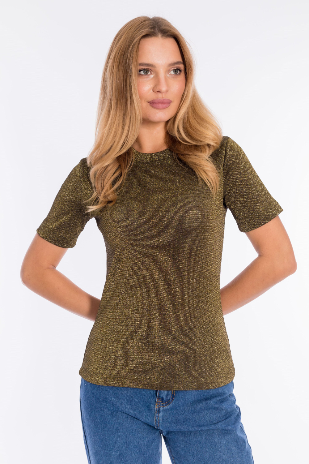 Футболка женская, облегающего силуэта, выполнена из кашкорсе с люрексом. Горловина с круглым вырезом, рукав короткий.
