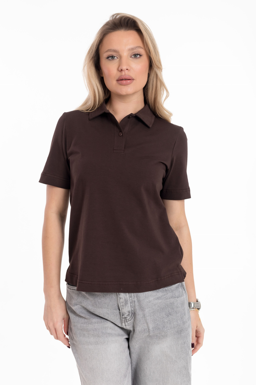 Футболка-поло выполнена из хлопкового полотна с лайкрой. Короткий рукав, воротник с застёжкой на две пуговицы. Внизу, по бокам декоративные разрезы.