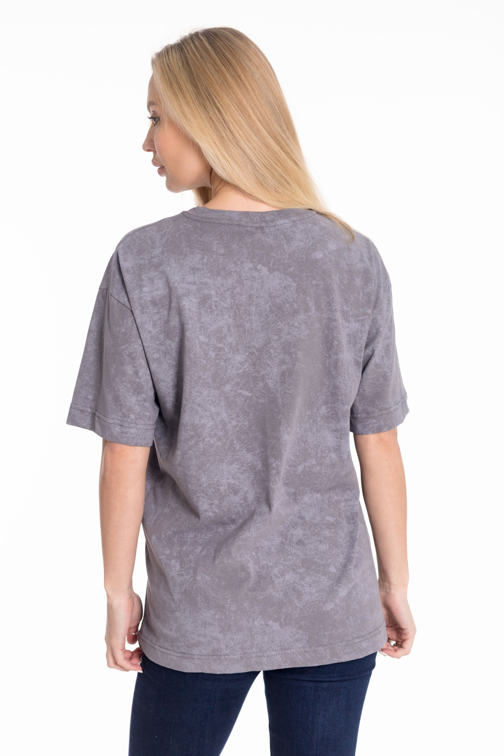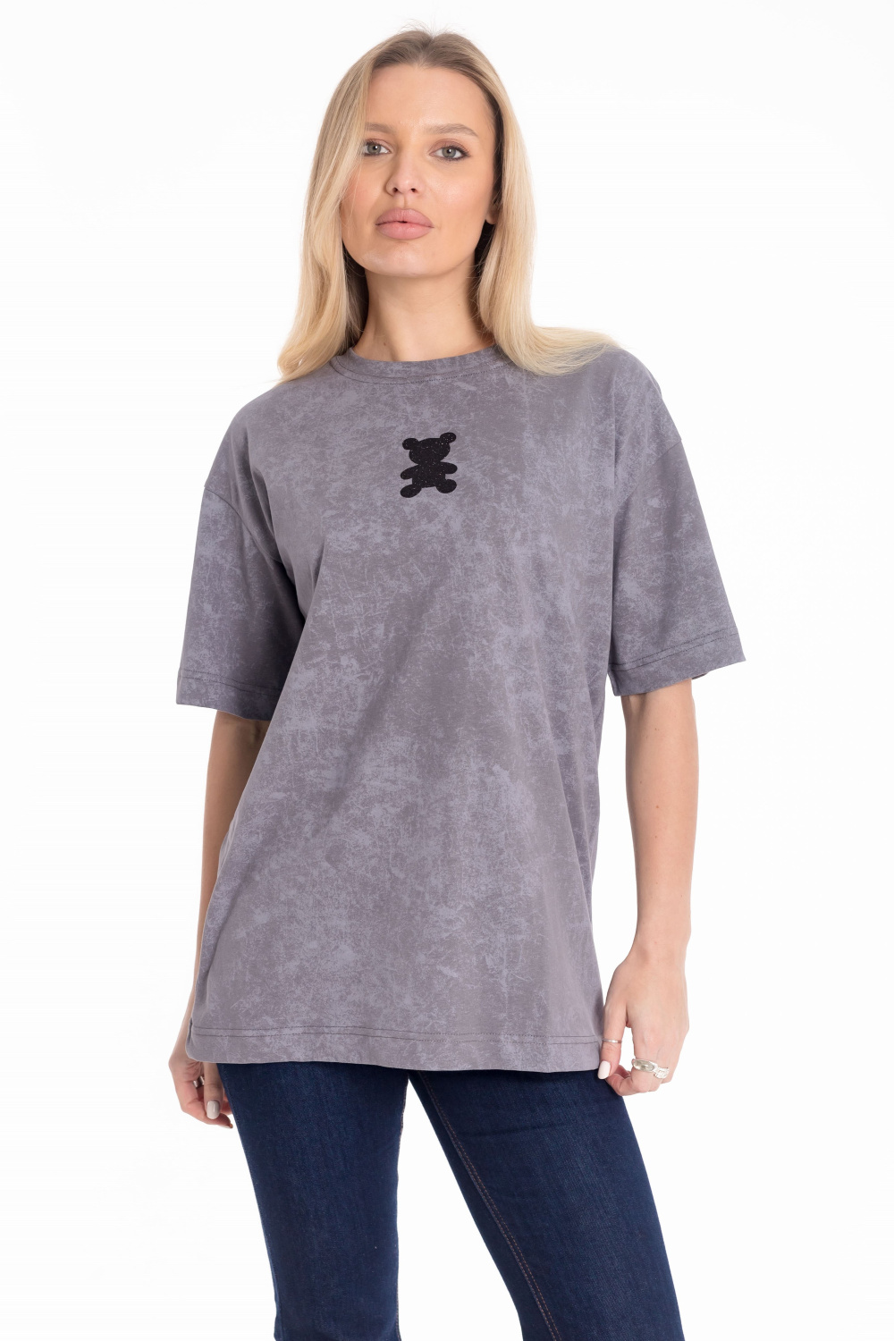 Женская футболка из лёгкой и приятной к телу ткани — отличный выбор для повседневного гардероба. Изготовлена из кулирки серого цвета, имеет свободный силуэт и круглый вырез горловины. Принт в виде мишки на полочке добавляет изделию оригинальность. Футболка идеально подойдёт для отдыха или домашней носки.