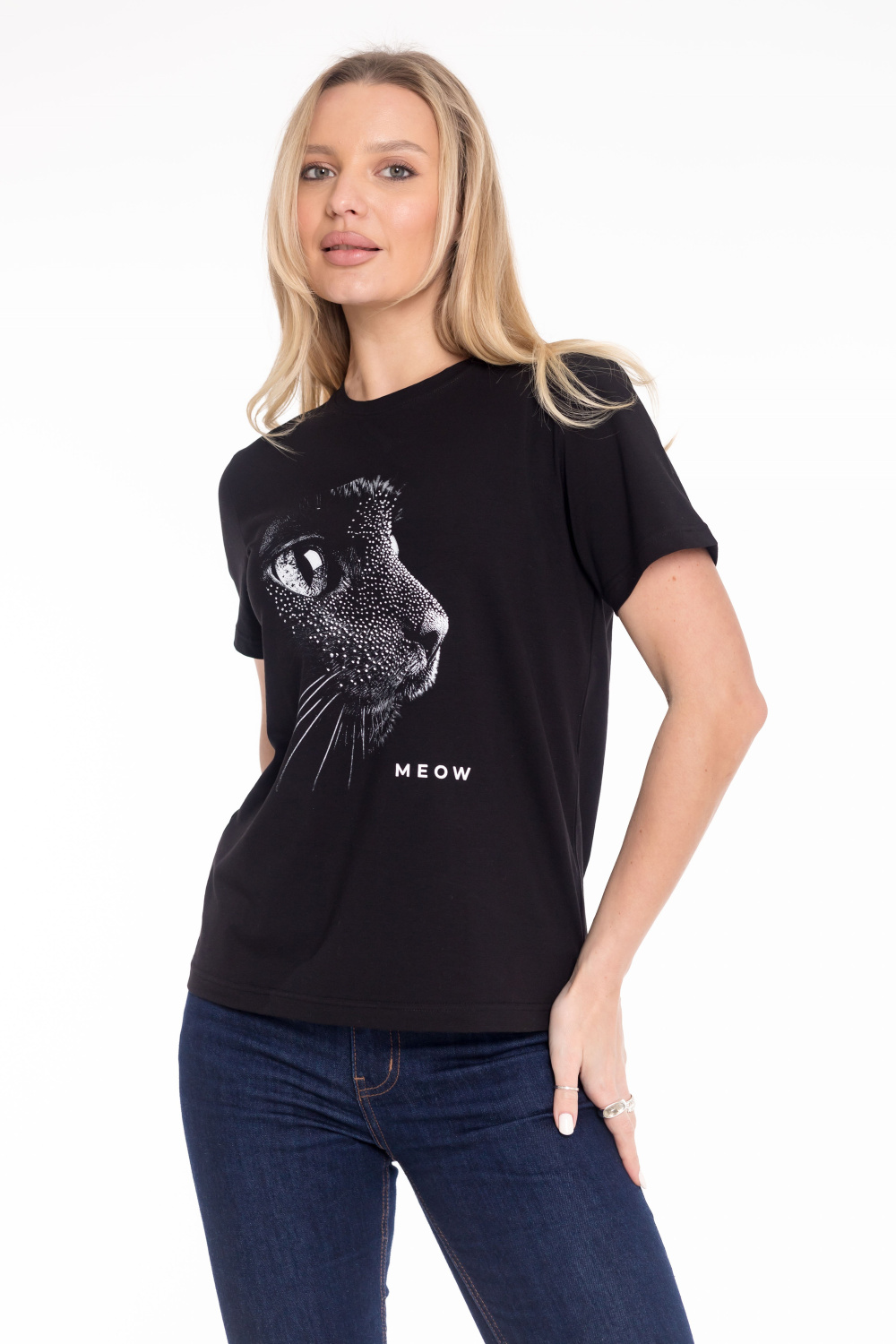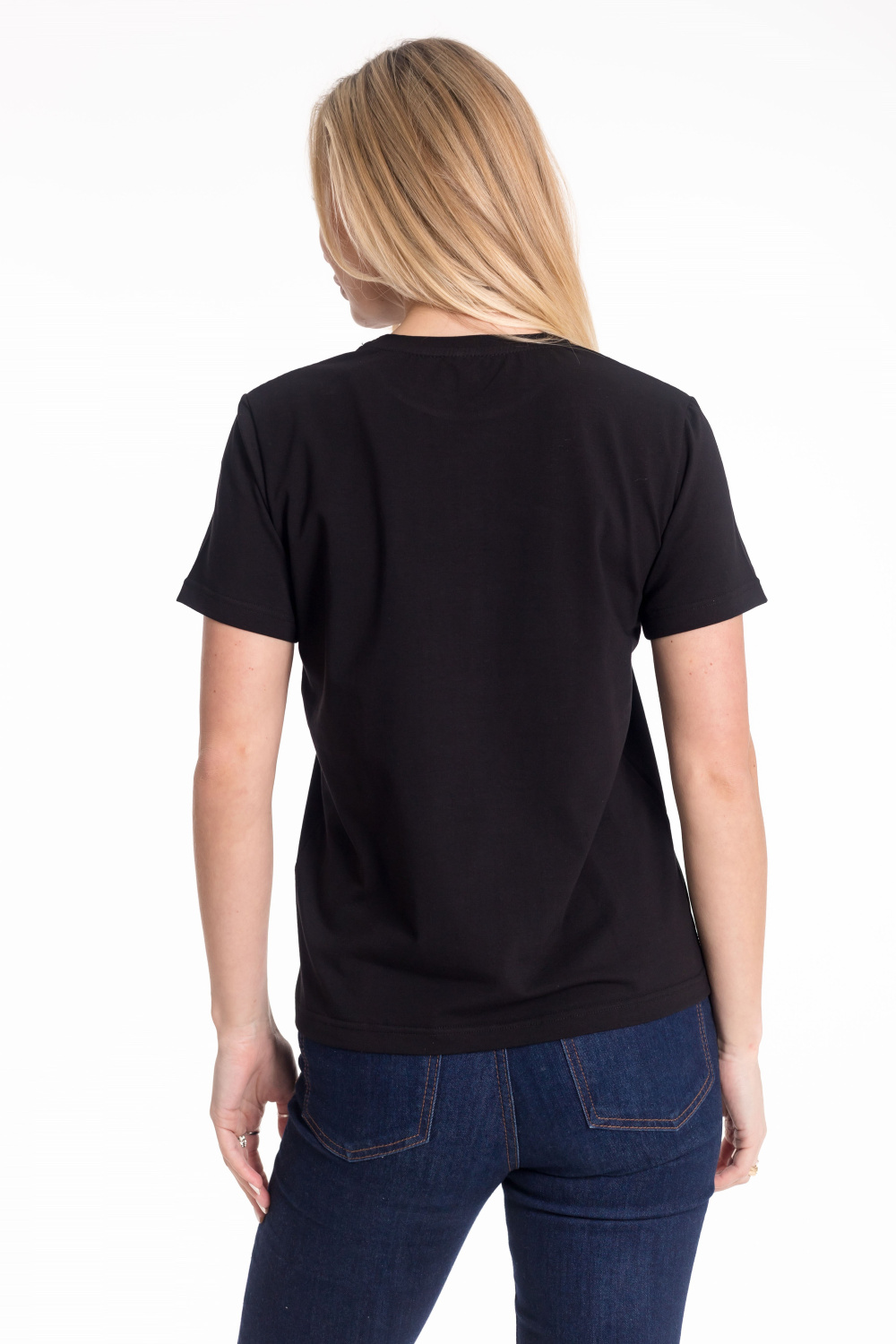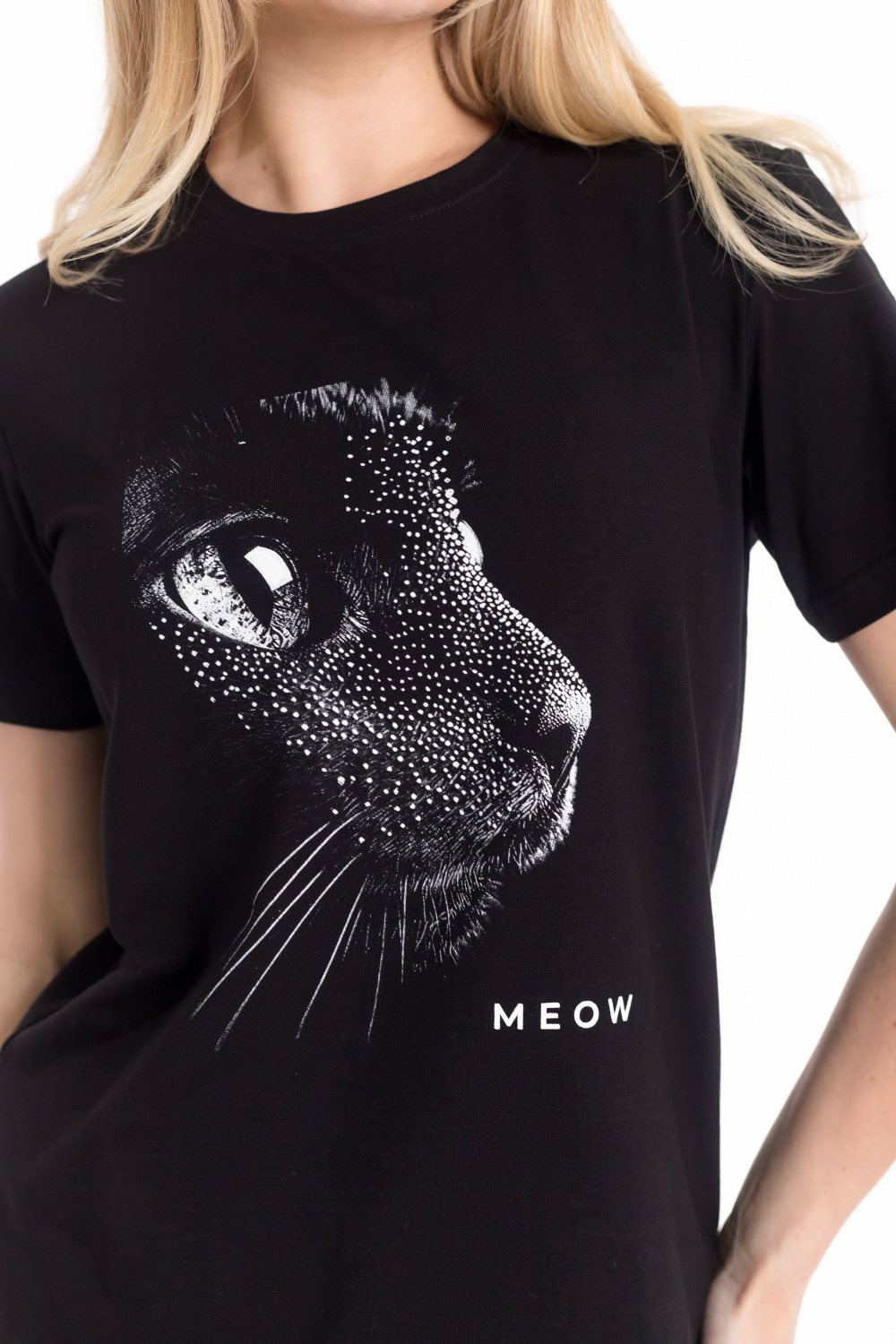 Женская футболка с принтом изготовлена из хлопкового полотна c добавлением лайкры, что обеспечивает комфорт и хорошую воздухопроницаемость. Футболка имеет короткий втачной рукав и круглый вырез горловины, что придает ей классический стильный вид. Такая модель базового черного цвета отлично сочетается с джинсами, брюками или юбкой. Изготовленная из натуральной ткани, футболка обеспечит комфорт в течение всего дня.