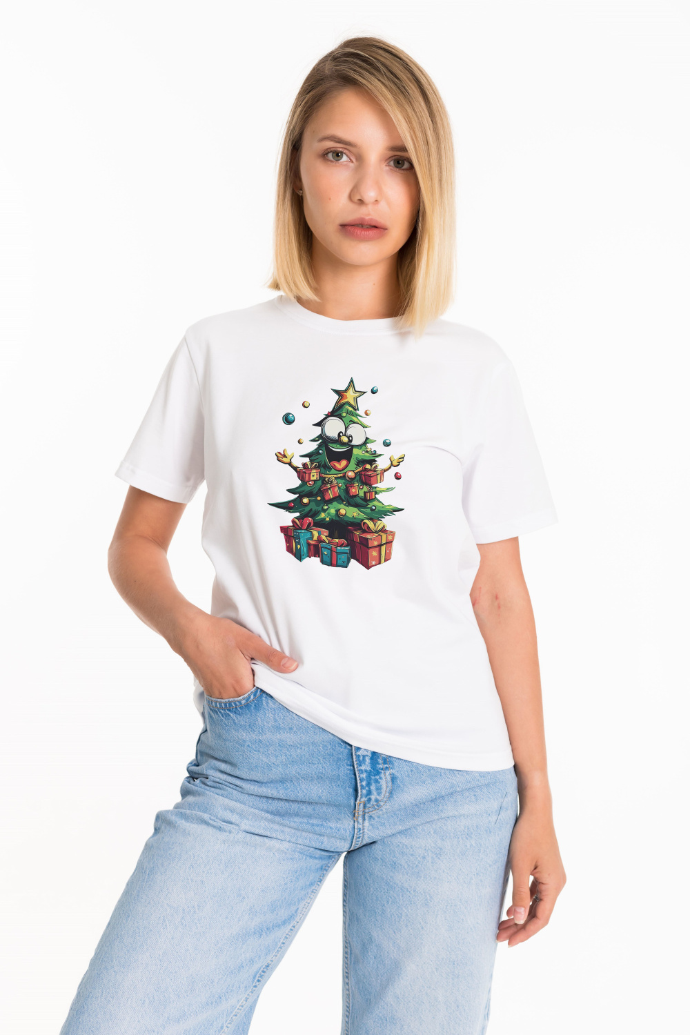 Футболка с новогодним принтом выполнена из хлопкового полотна с добавлением лайкры. Материал приятен к телу, создает комфорт и хорошую воздухопроницаемость. Классический крой с коротким рукавом и круглым вырезом горловины обеспечивает удобную посадку и свободу движений. Отличный выбор для создания праздничного настроения и комфортных повседневных образов.