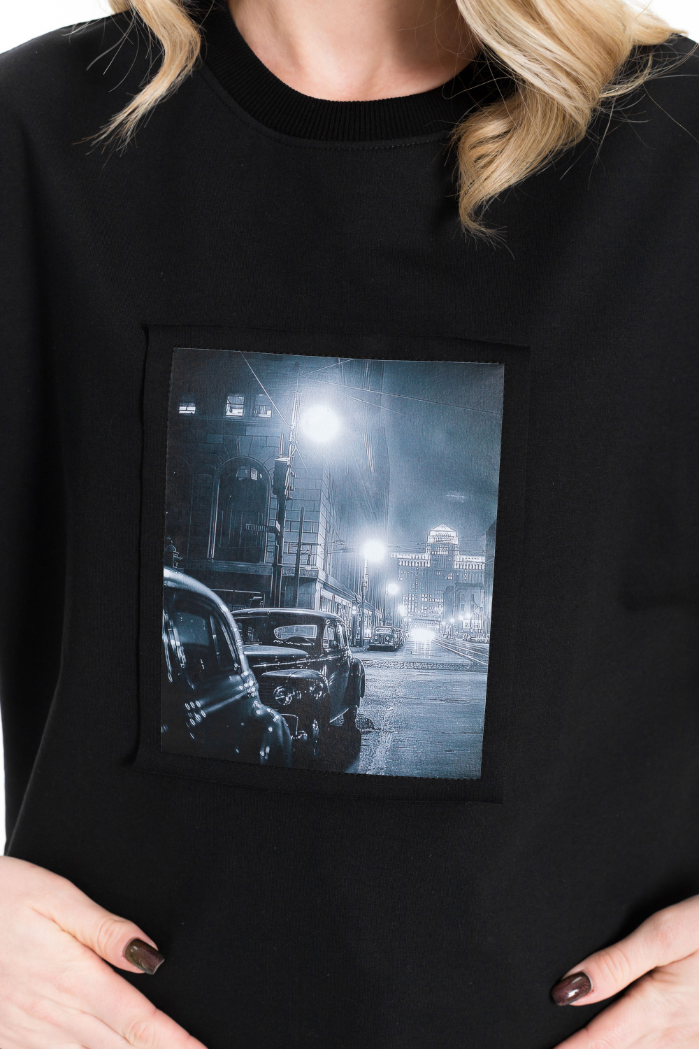 Женская футболка в стиле оверсайз с короткими спущенными рукавами. Футболка выполнена из футера двухнитки, круглый вырез горловины оформлен планкой. Крупный принт спереди.