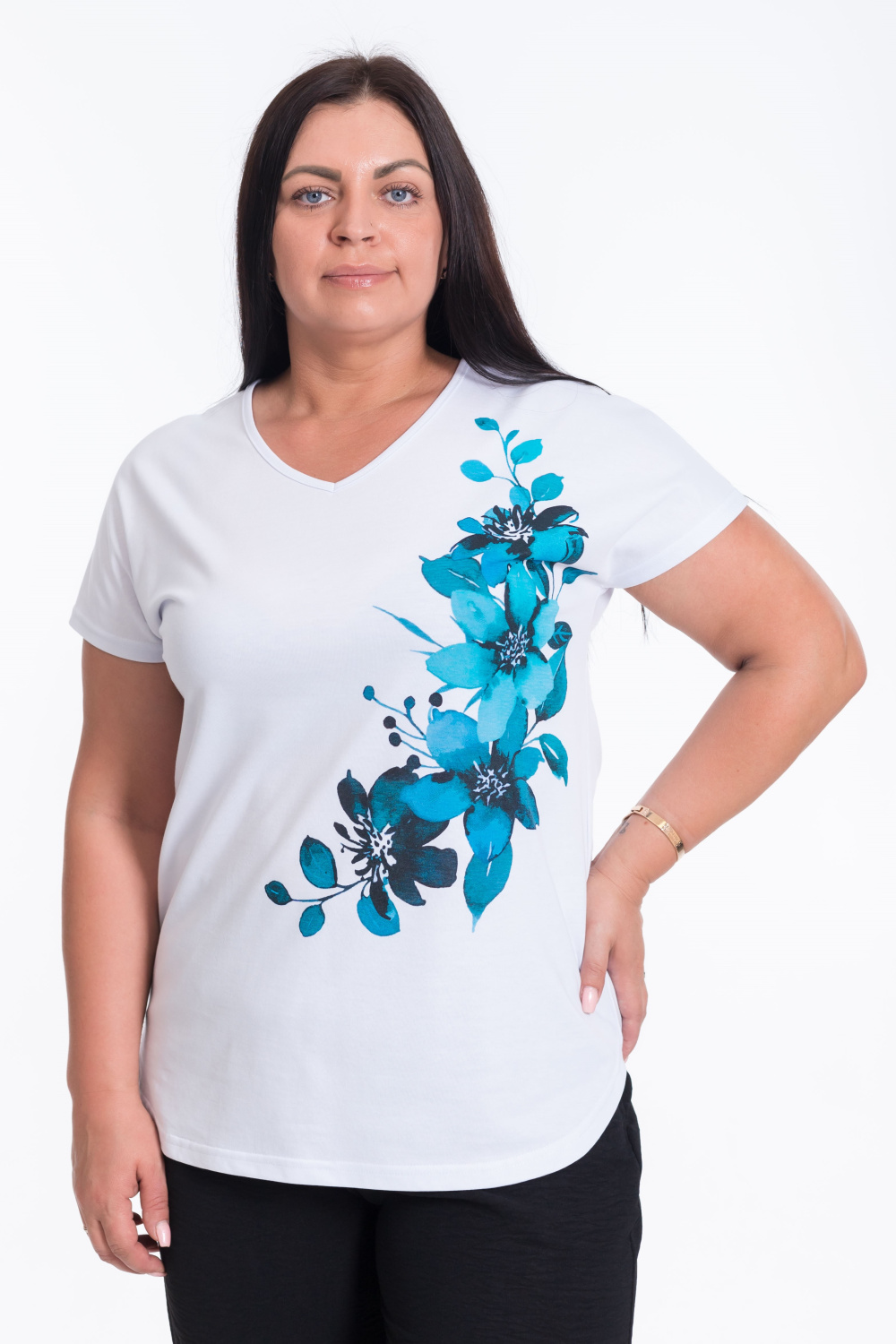 Футболка имеет V-образный вырез, который делает образ более элегантным и стильным. Спущенная линия плеча добавляет свободу движений, а закругления низа к боковым швам придают модели женственность.