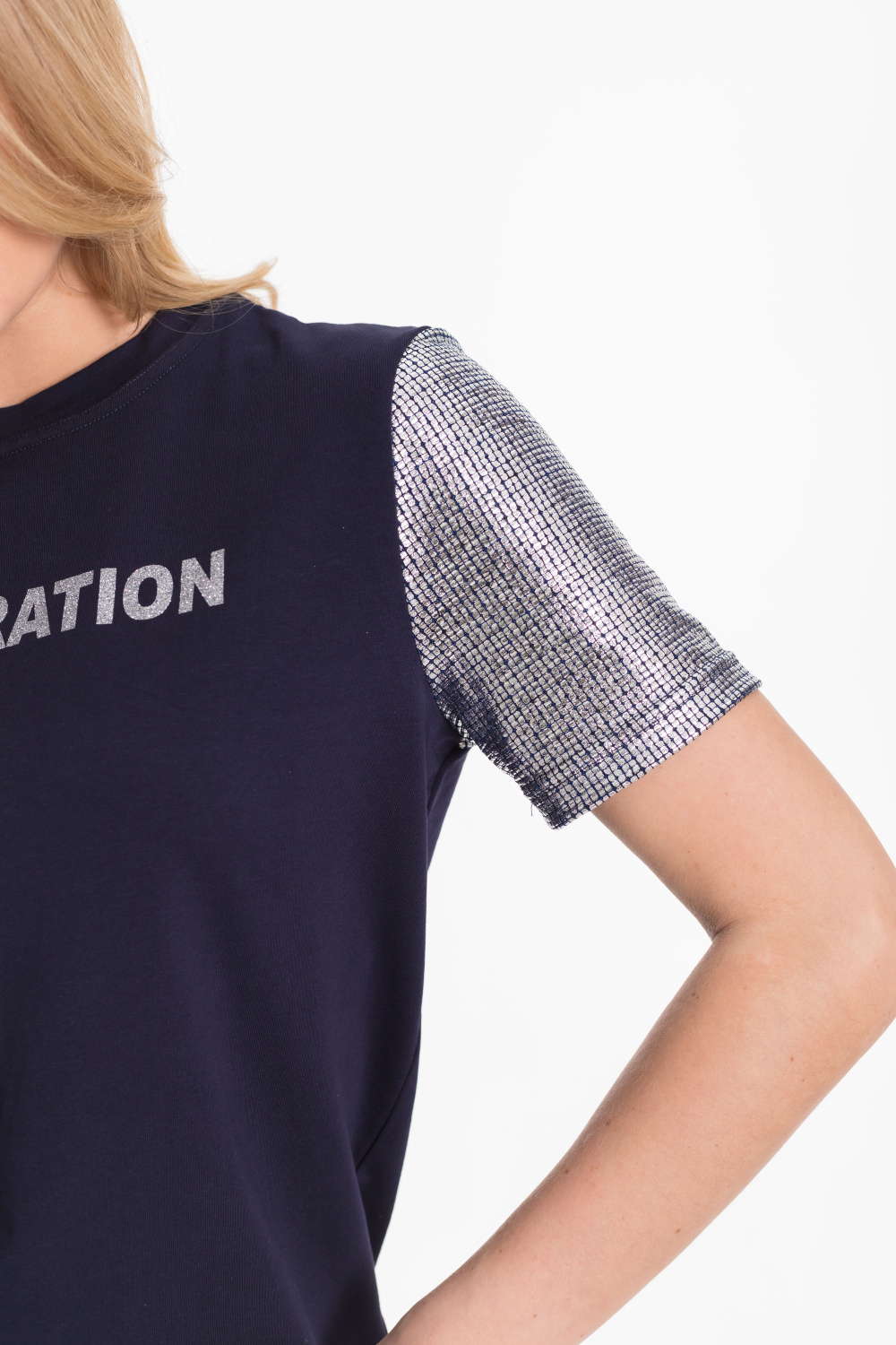 Футболка из однотонной кулирки с лайкрой и вискозы цвета серебра. Короткий втачной рукав в цвет отделочного полотна.