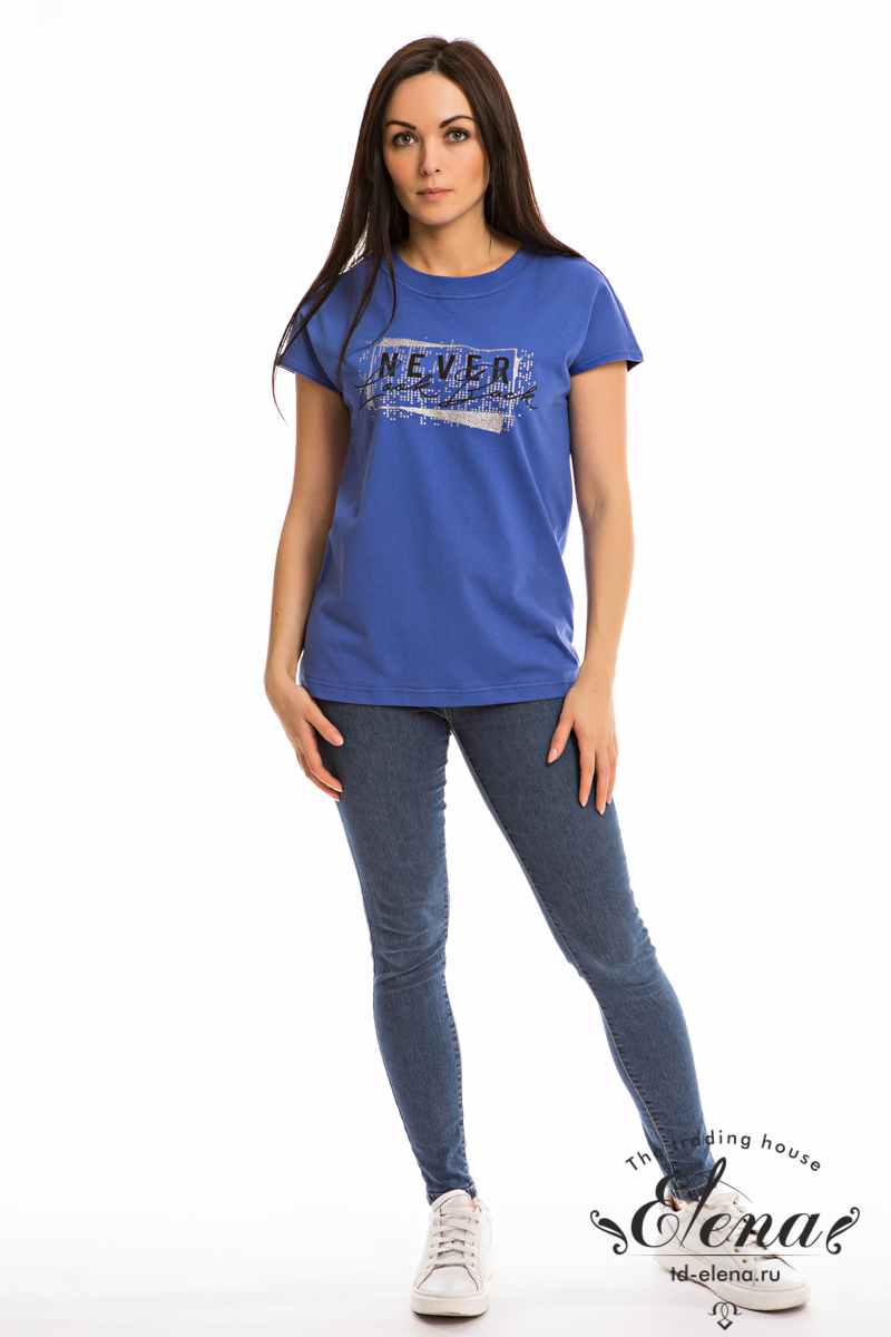 Футболка с принтом спереди выполнена из однотонной кулирки. Круглый вырез горловины оформлен планкой. Линия плеча спущена,низ футболки разноуровневый, спинка длиннее переда.