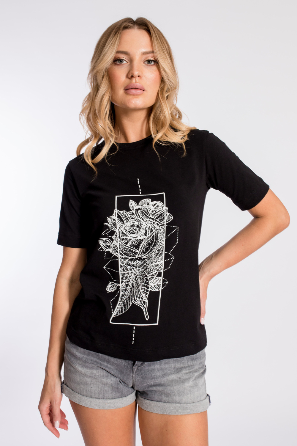 Футболка из кулирки с лайкрой с коротким втачным рукавом. Силуэт полуприлегающий, круглый вырез горловины оформлен притачной планкой. Спереди нанесён принт.