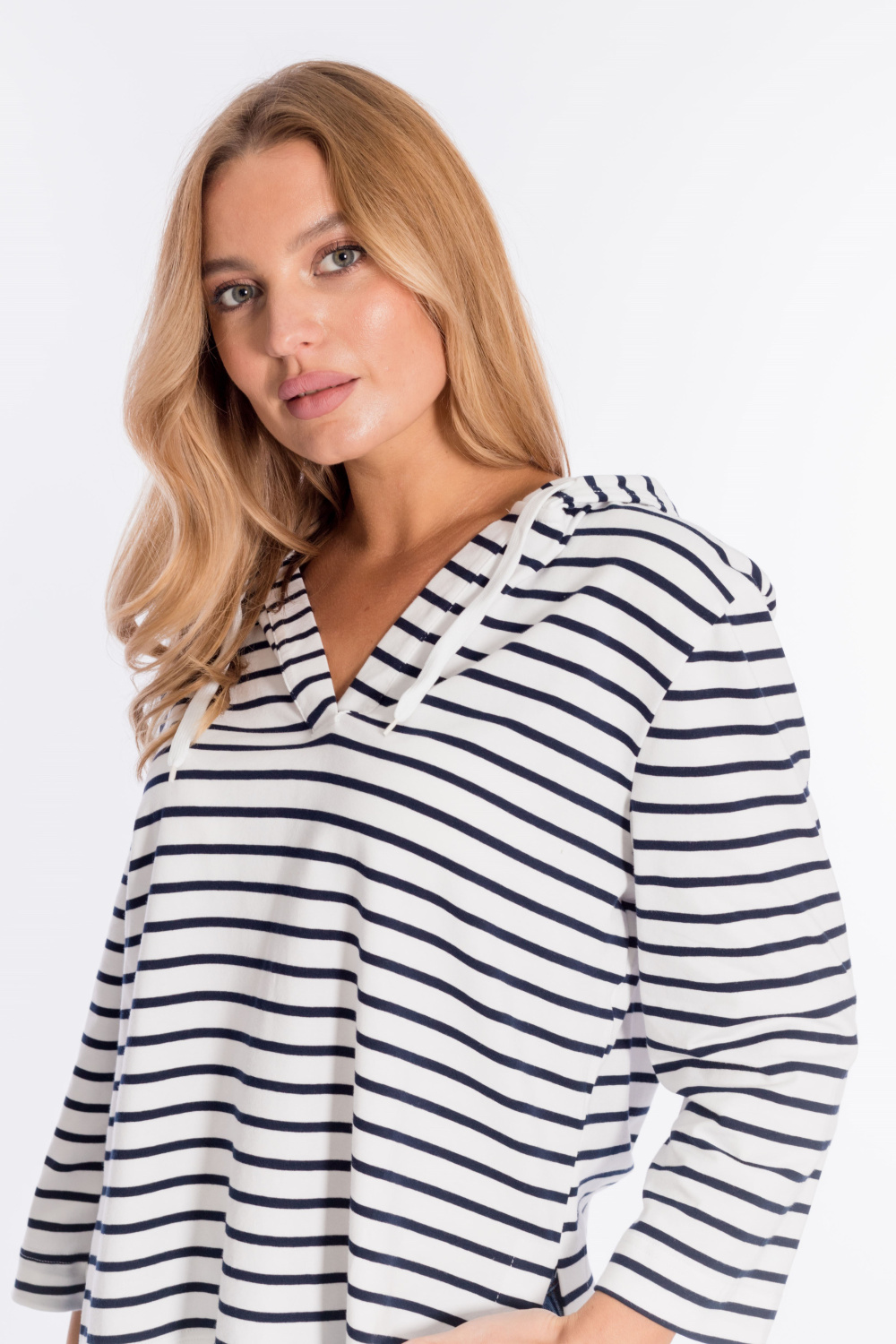 Футболка в полоску выполнена из кулирки с лайкрой. С капюшоном со шнуром и рукавом длиной 3/4. Горловина с V-образым вырезом с планками, переходящими в капюшон. Внизу изделия, в боковых швах декоративные разрезы.