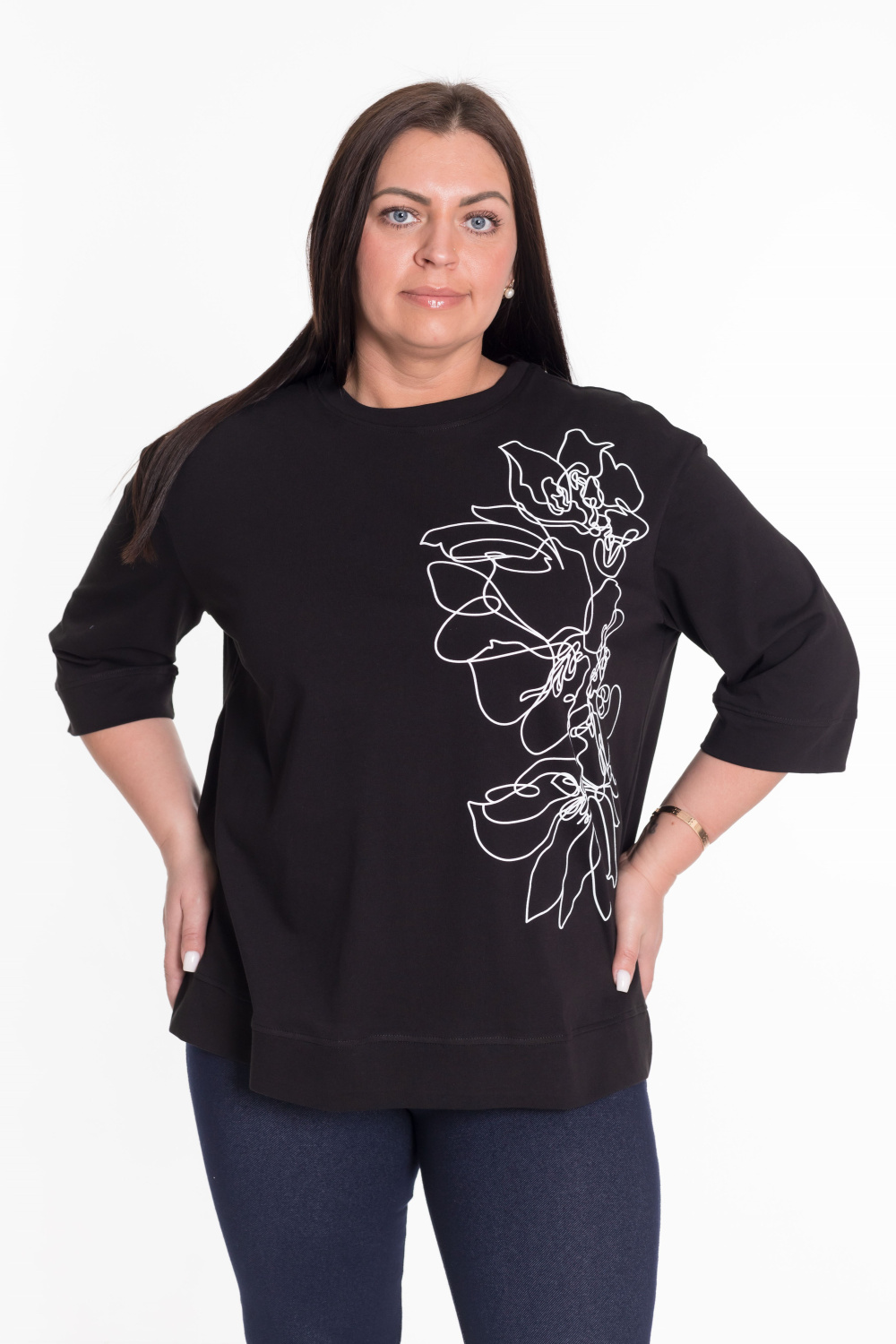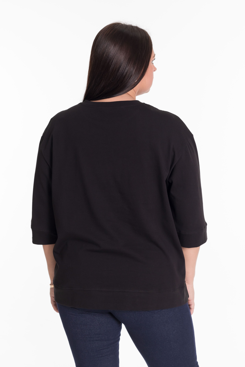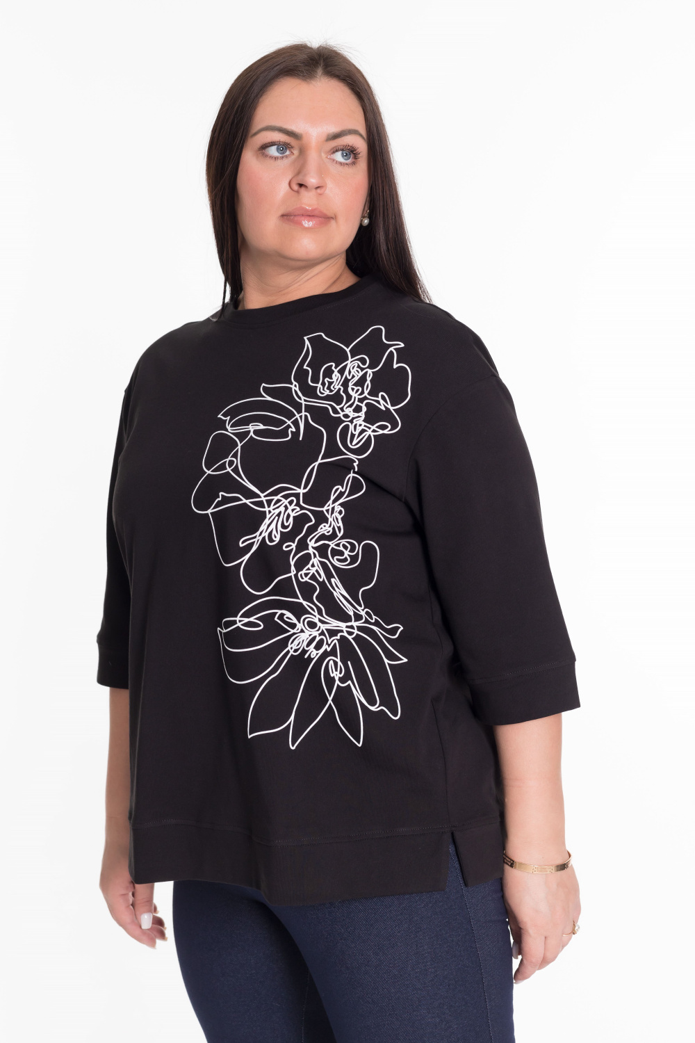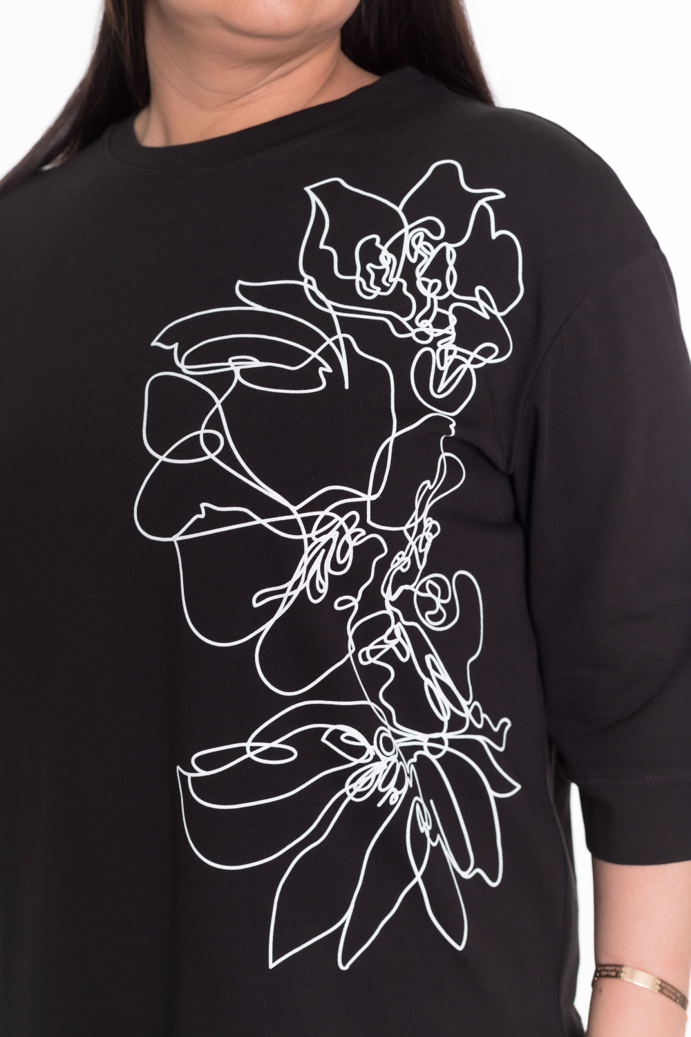 Футболка выполнена из однотонной кулирки. Рукава длиной 3/4, круглый вырез горловины оформлен планкой. Спереди расположен красивый принт. Внизу, в боковых швах декоративные разрезы.