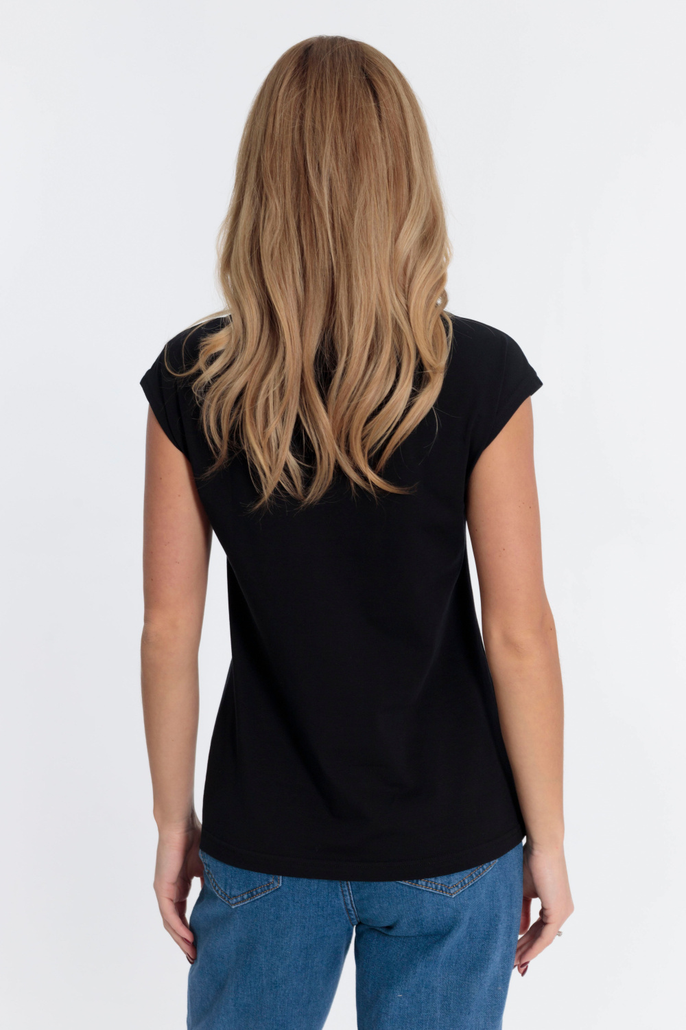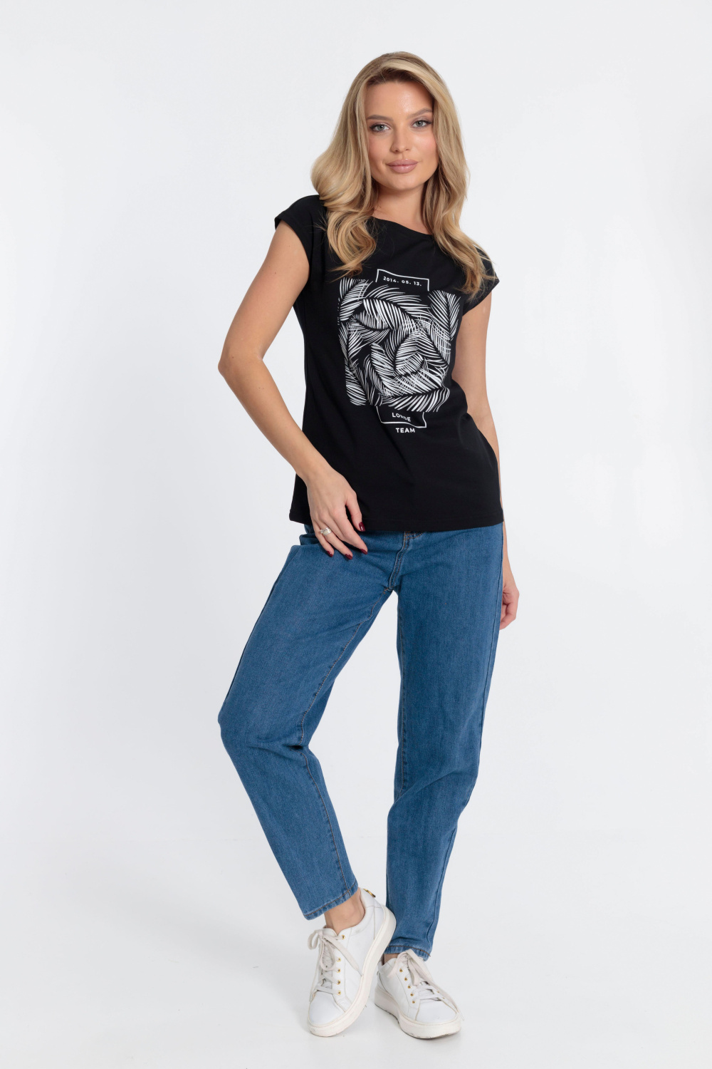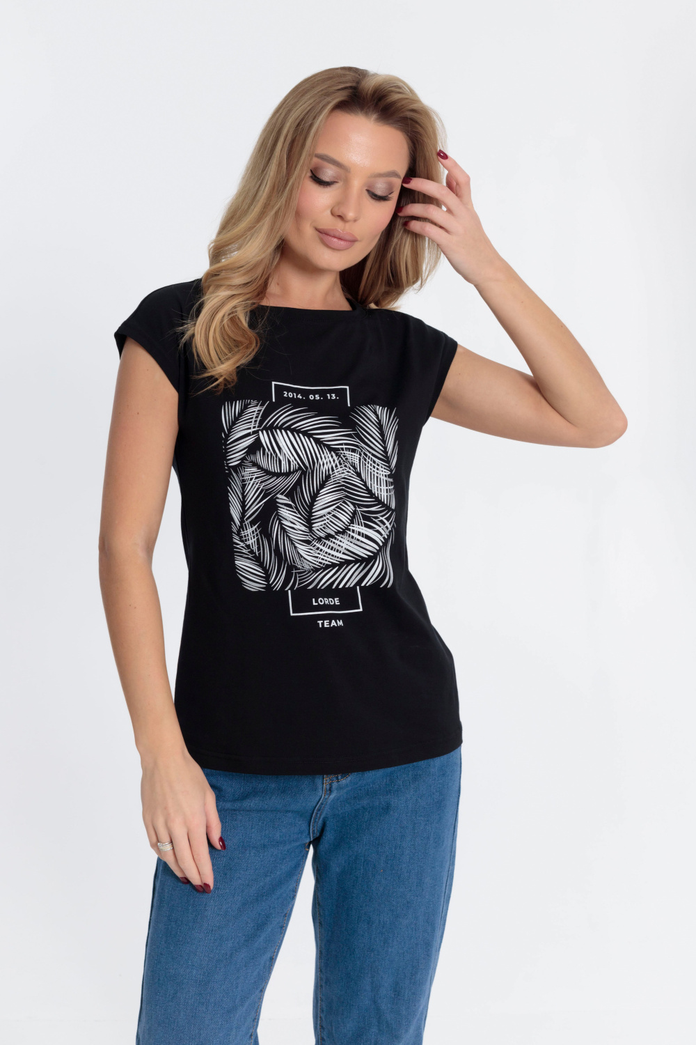 Спущенная линия плеча, горловина "лодочка", спереди принт.