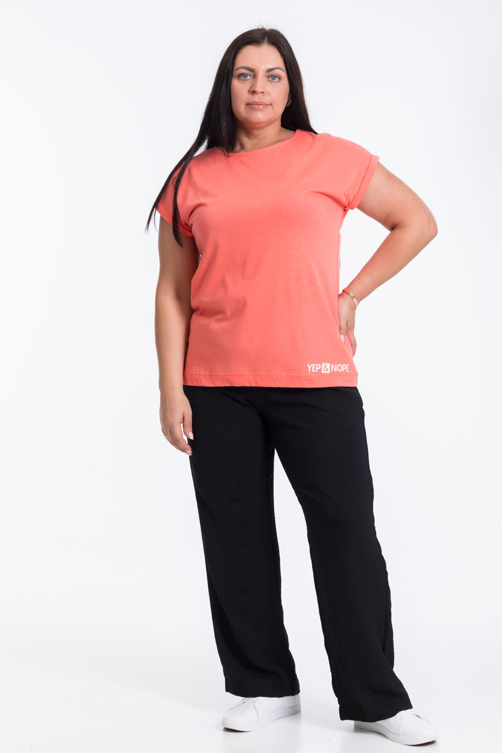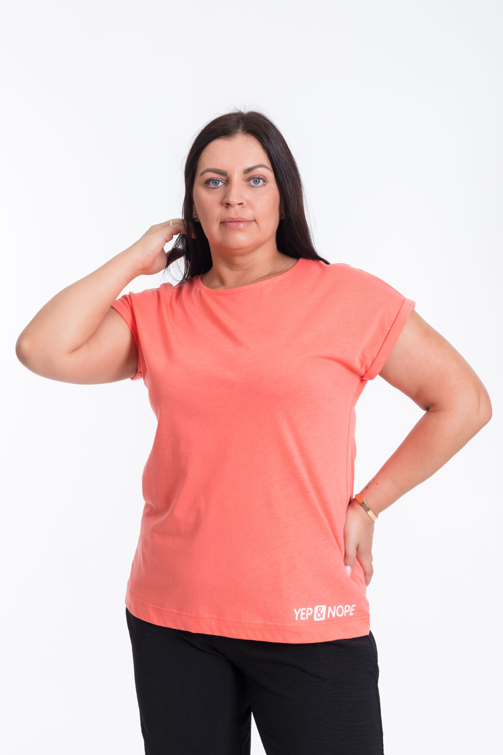 Женская футболка из кулирки — отличный выбор для повседневной носки. Изготовленная из мягкой и приятной к телу ткани, она обеспечивает комфорт в течение дня. Круглый вырез горловины и короткие цельнокроеные рукава с отворотами придают изделию аккуратный вид. Наличие принта спереди добавляет футболке оригинальности. Однотонный коралловый цвет позволяет сочетать её с различными элементами гардероба. Футболка подойдёт для прогулок, неформальных встреч или отдыха.