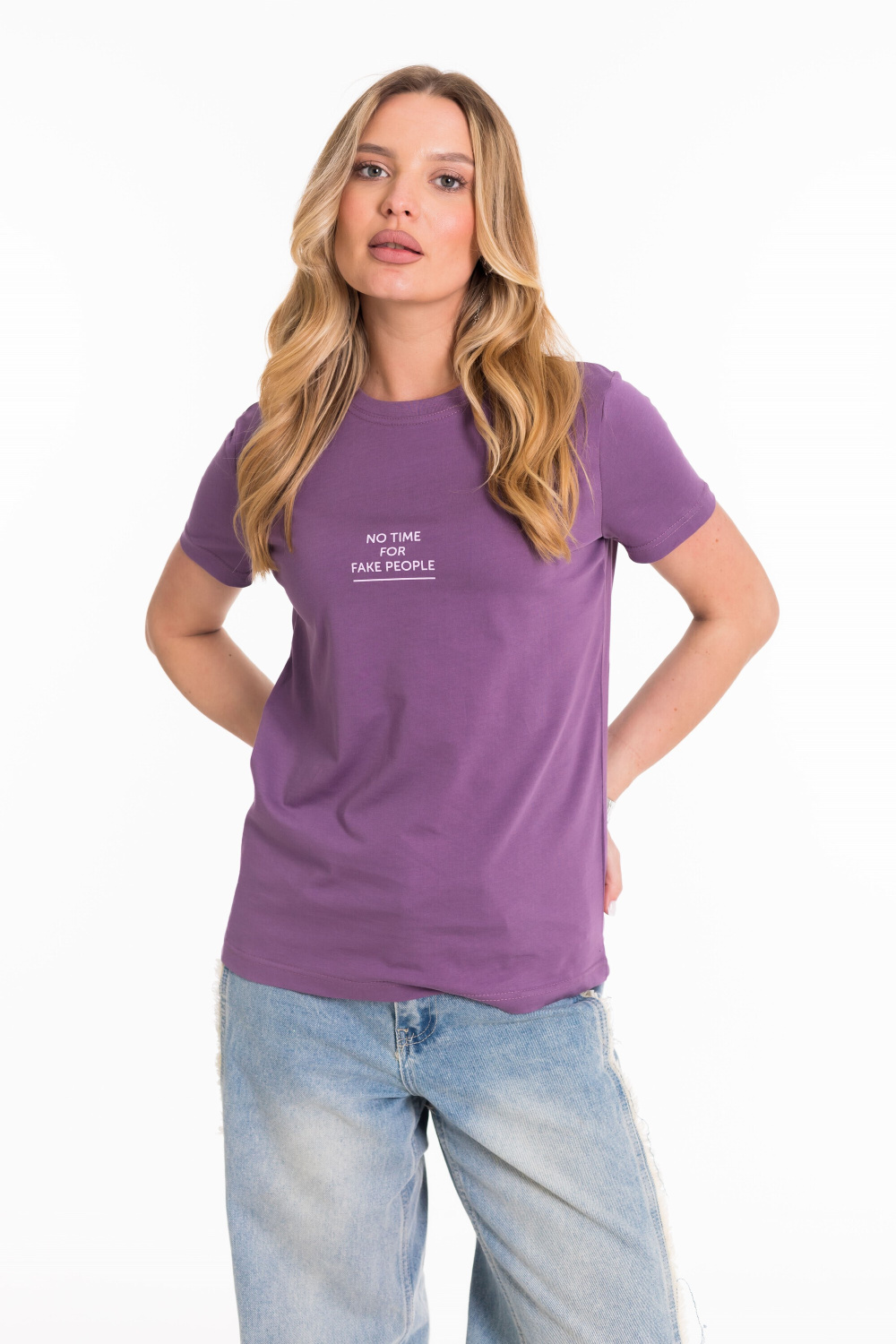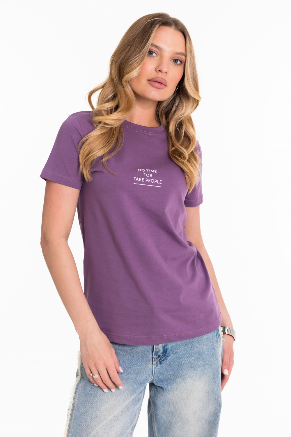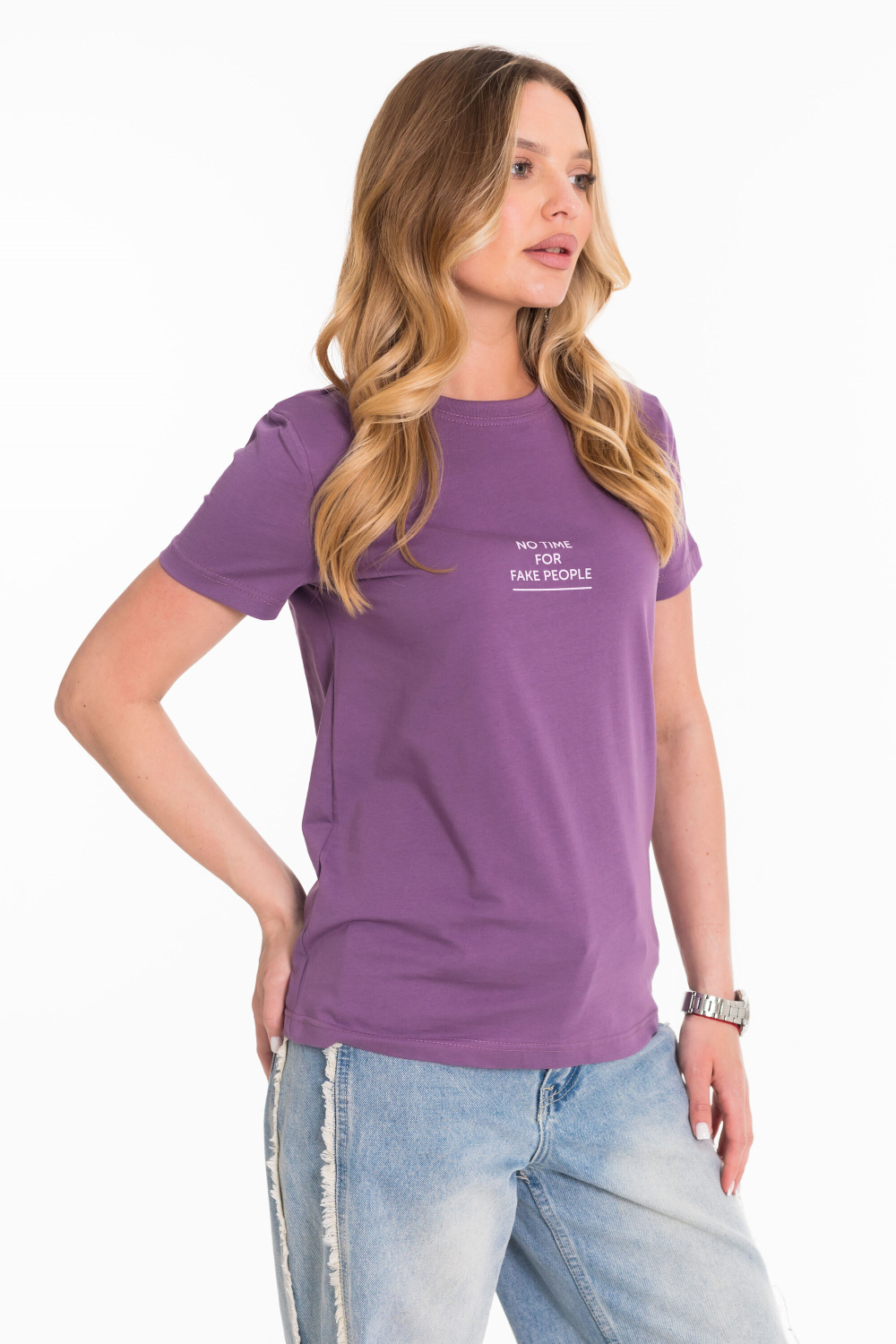 Футболка из однотонной кулирки с коротким втачным рукавом, с принтом спереди.