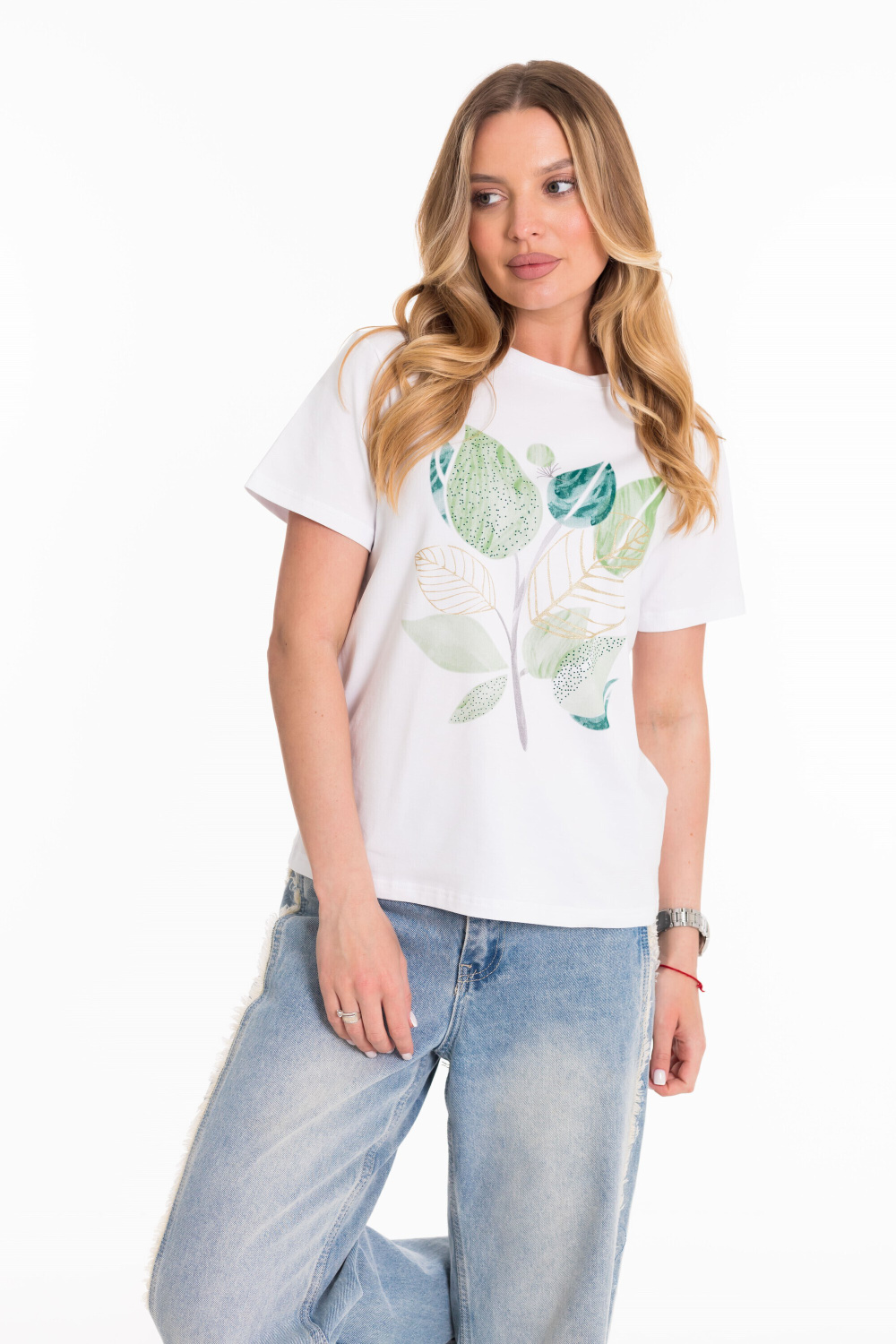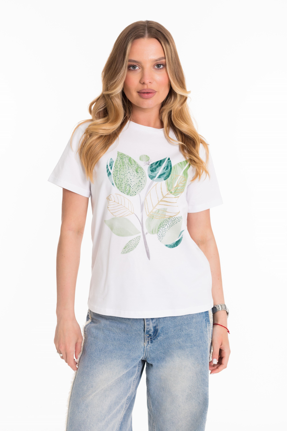 Женская футболка изготовлена из хлопкового полотна с добавлением лайкры, что обеспечивает комфорт и хорошую воздухопроницаемость. Футболка с коротким втачным рукавом и круглым вырезом горловины, что придает ей классический стильный вид. Спереди нанесён оригинальный принт.