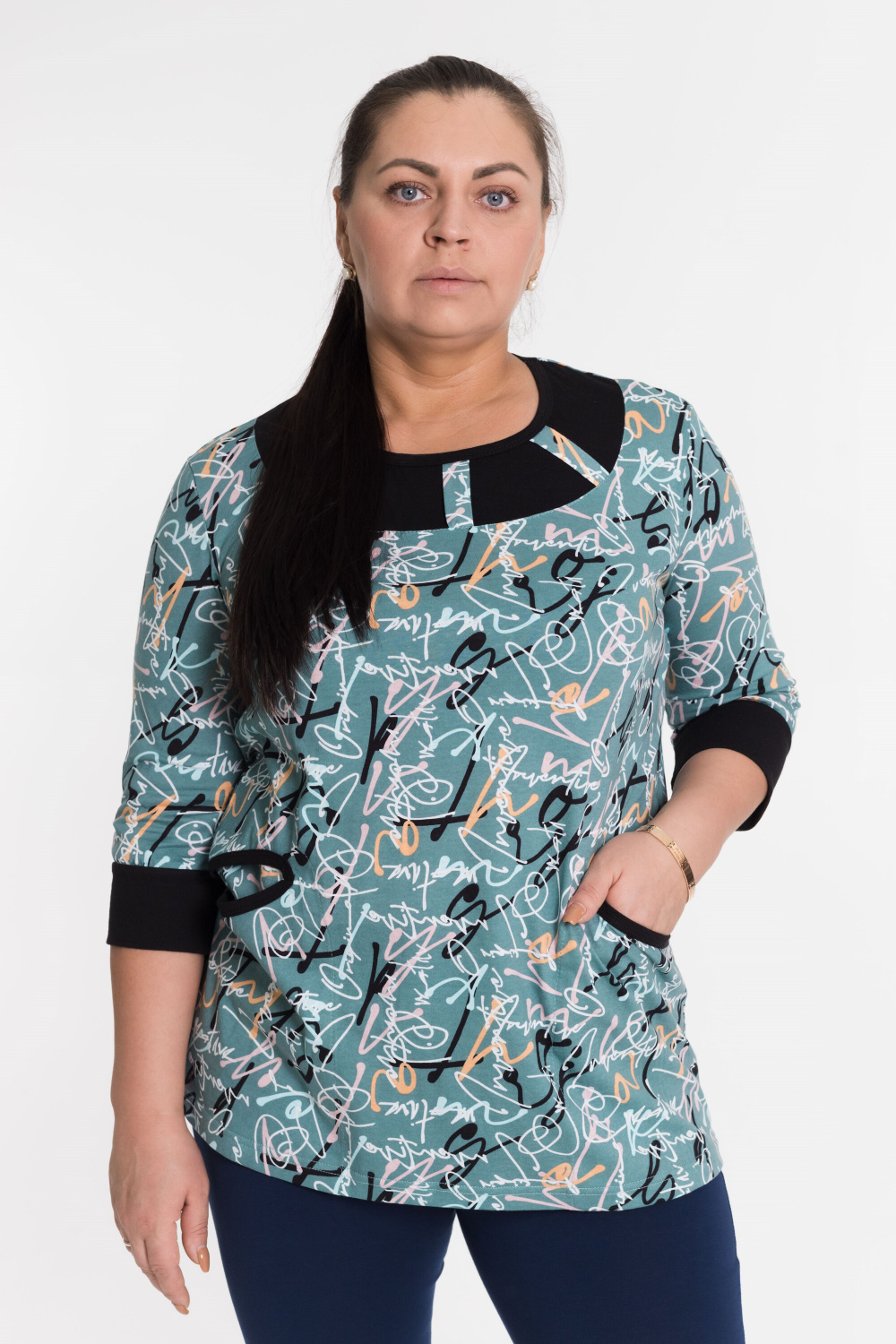 Футболка выполнена из кулирки с набивным рисунком. Манжеты на рукавах, карманы и горловина с отделкой из однотонного полотна. Горловина обработана бейкой, в качестве отделки паты из полотна с набивкой.