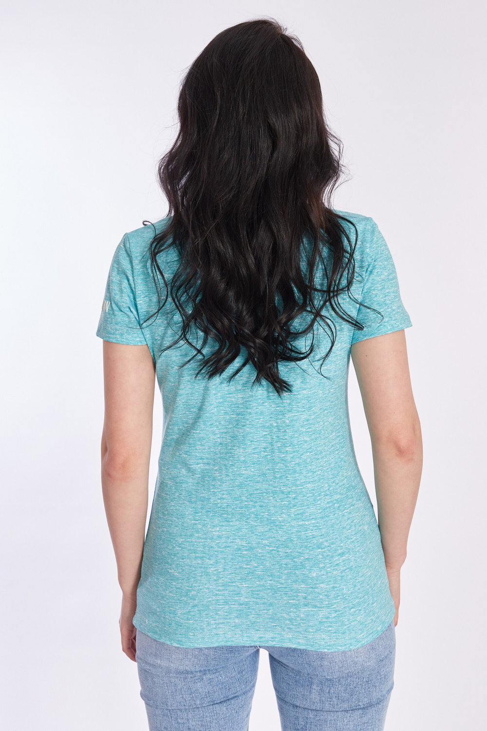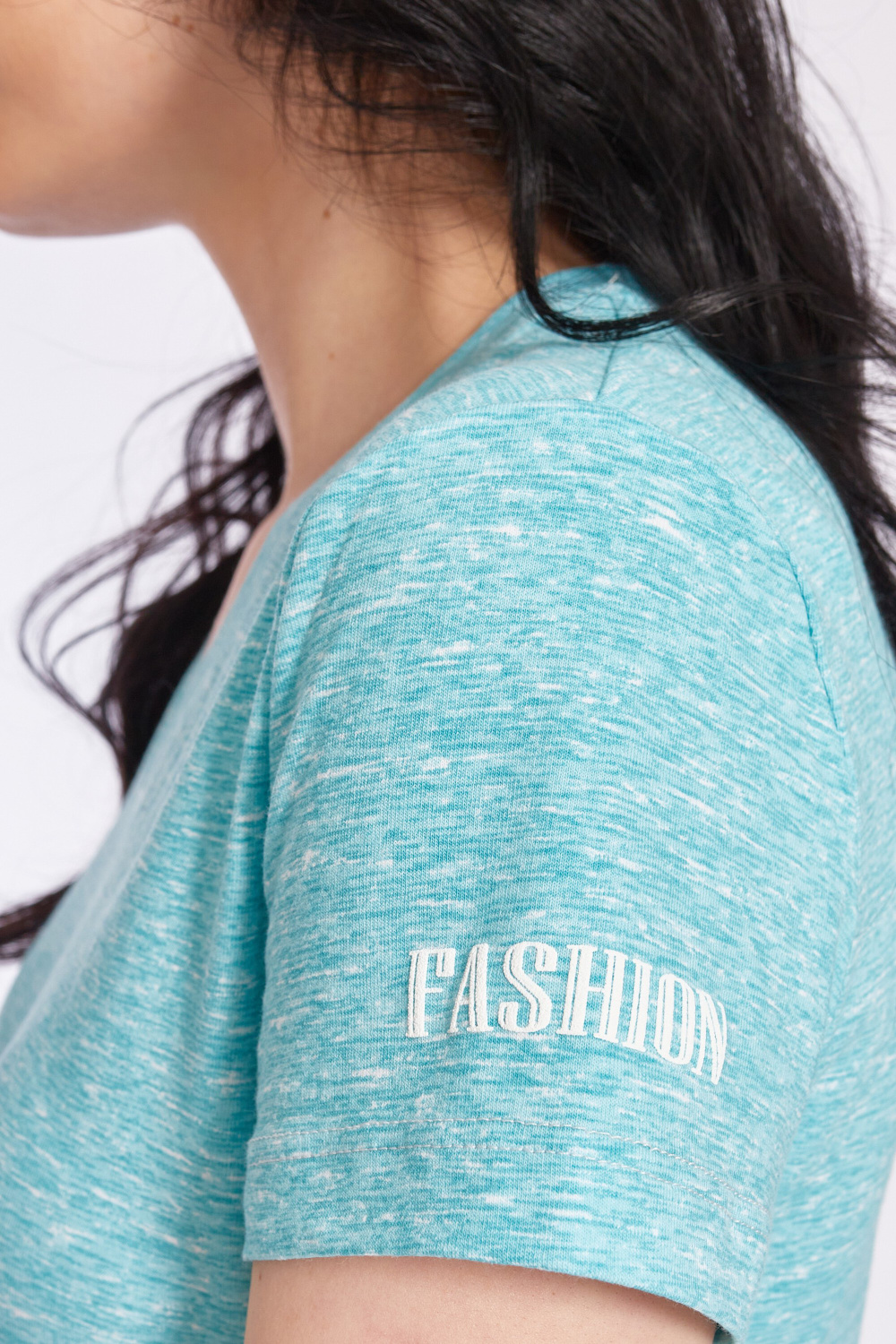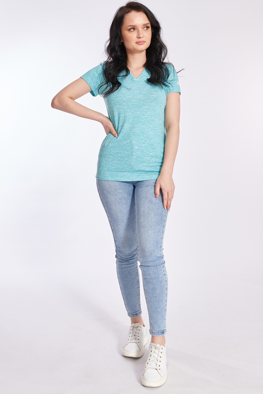 Футболка выполнена из кулирки с лайкрой, силуэт приталенный, рукав короткий, горловина имеет V-образный вырез. На левом рукаве нанесён принт.