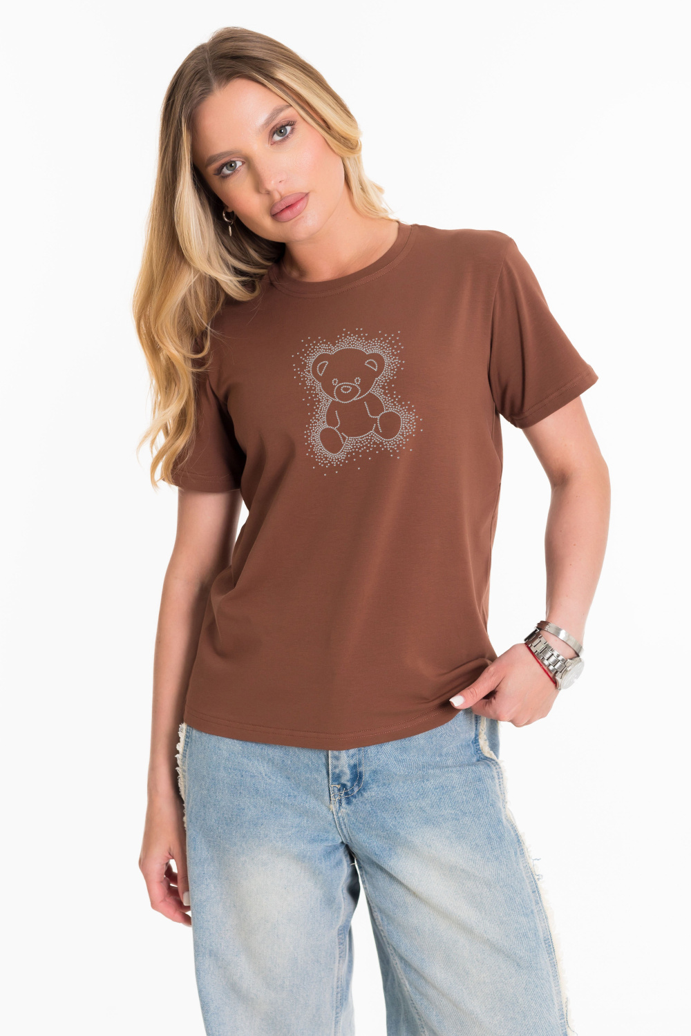 Женская футболка с принтом спереди изготовлена из хлопкового полотна с добавлением лайкры. Футболка с коротким втачным рукавом и круглым вырезом горловины, что придает ей классический стильный вид. Такая модель футболки отлично сочетается с джинсами, брюками или юбкой. Изготовленная из натуральной ткани, футболка обеспечит комфорт в течение всего дня.