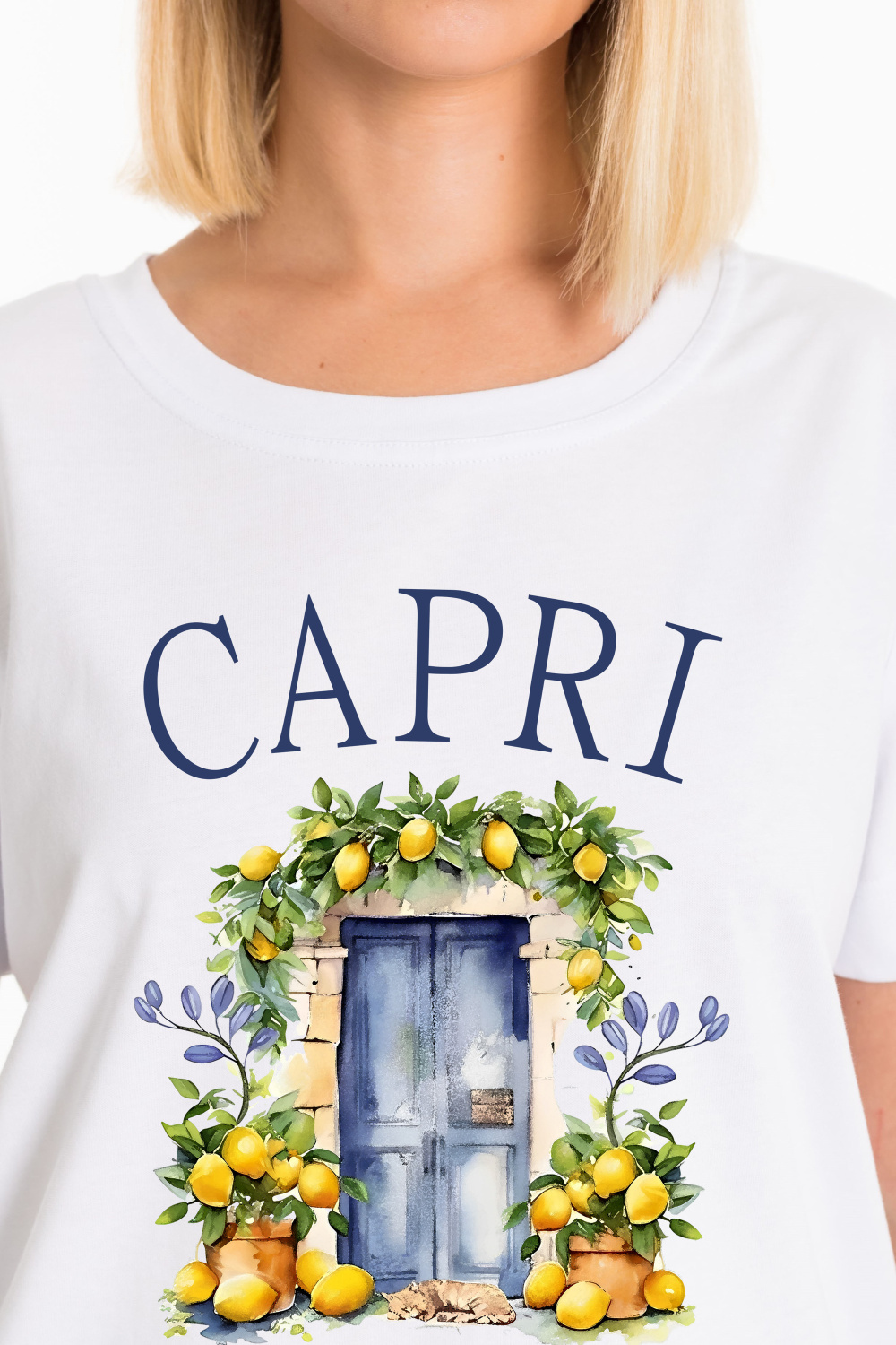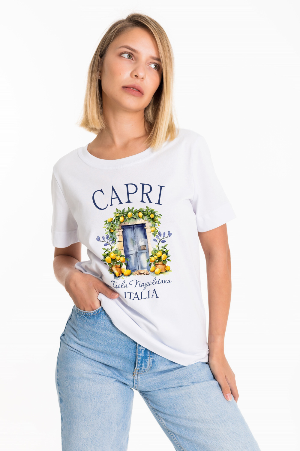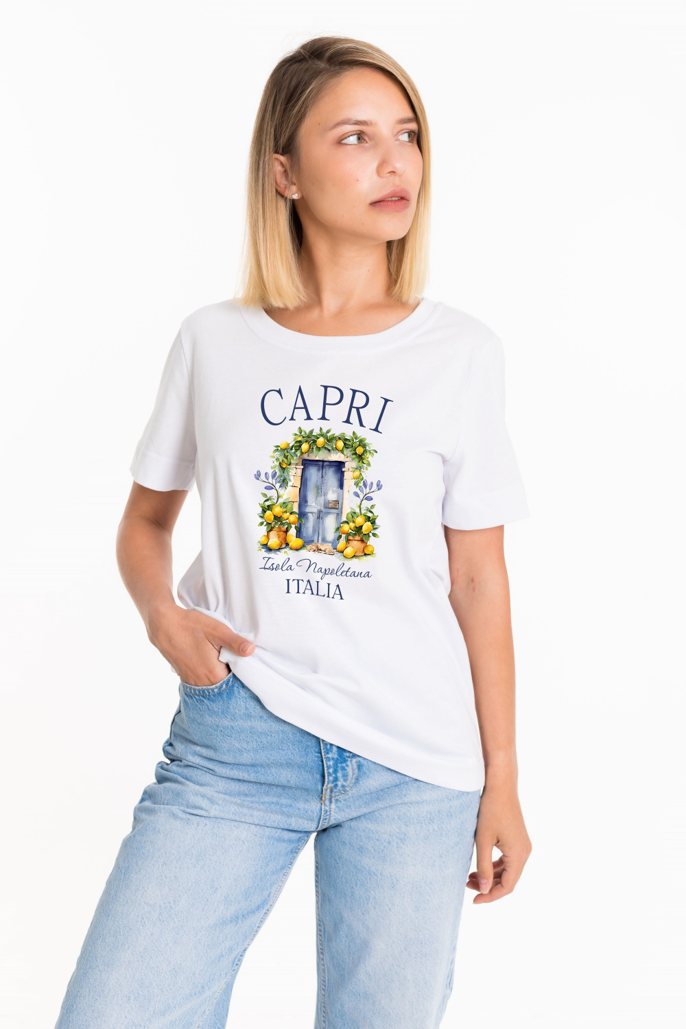 Женская футболка с принтом изготовлена из хлопкового полотна, что обеспечивает комфорт и хорошую воздухопроницаемость. Футболка имеет короткий рукав и круглый вырез горловины, что придает ей классический стильный вид. Такая модель футболки отлично сочетается с джинсами, брюками или юбкой. Изготовленная из натуральной ткани, футболка обеспечит комфорт в течение всего дня.