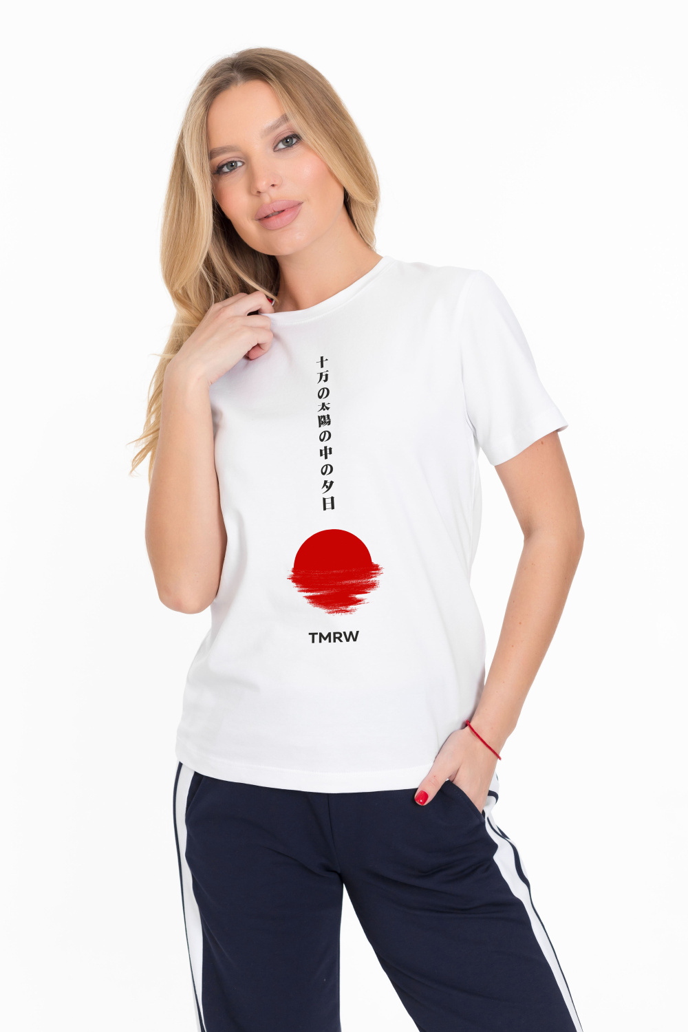 Женская футболка с принтом спереди изготовлена из хлопкового полотна с добавлением лайкры. Футболка с коротким втачным рукавом и круглым вырезом горловины, что придает ей классический стильный вид. Такая модель футболки отлично сочетается с джинсами, брюками или юбкой. Изготовленная из натуральной ткани, футболка обеспечит комфорт в течение всего дня.