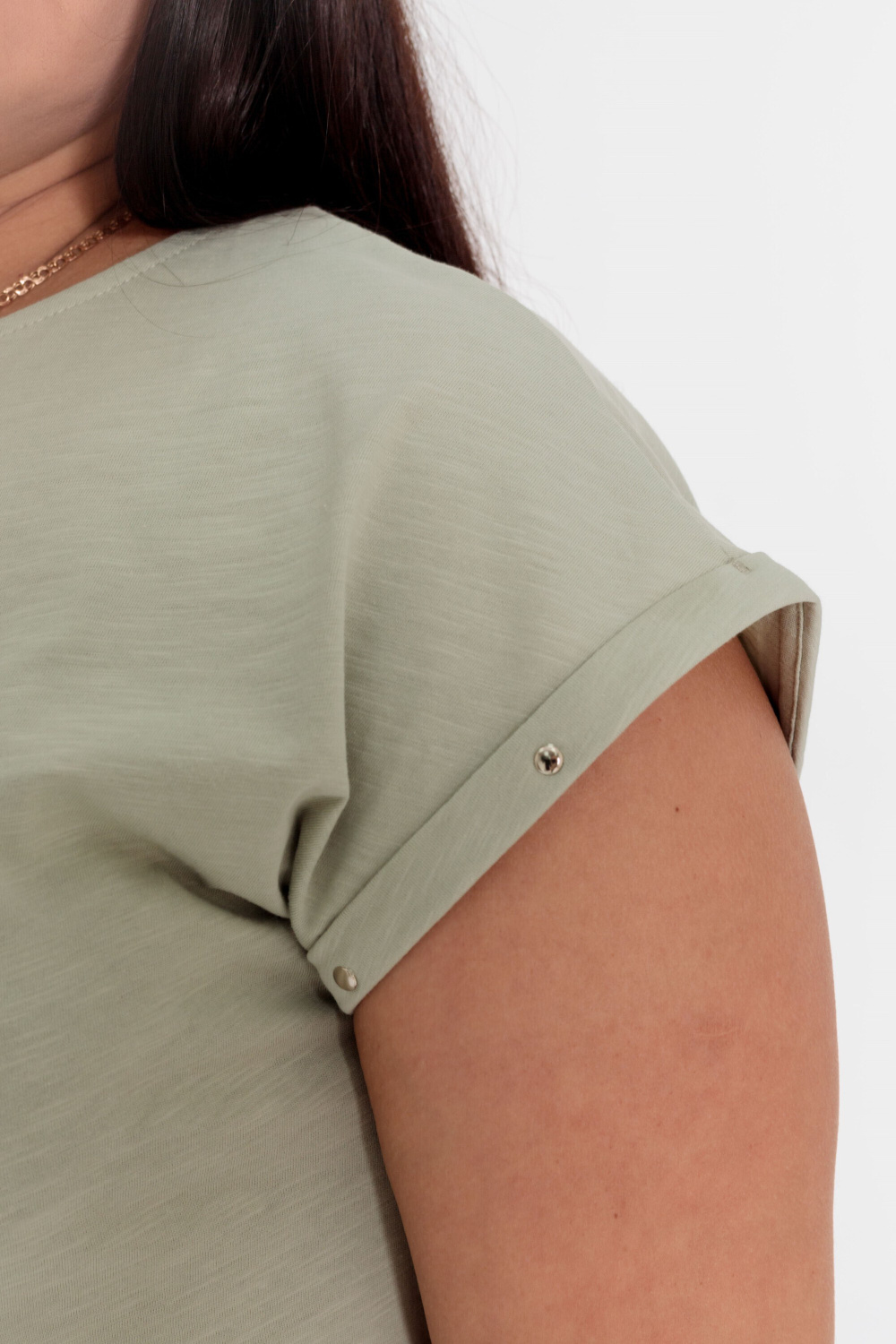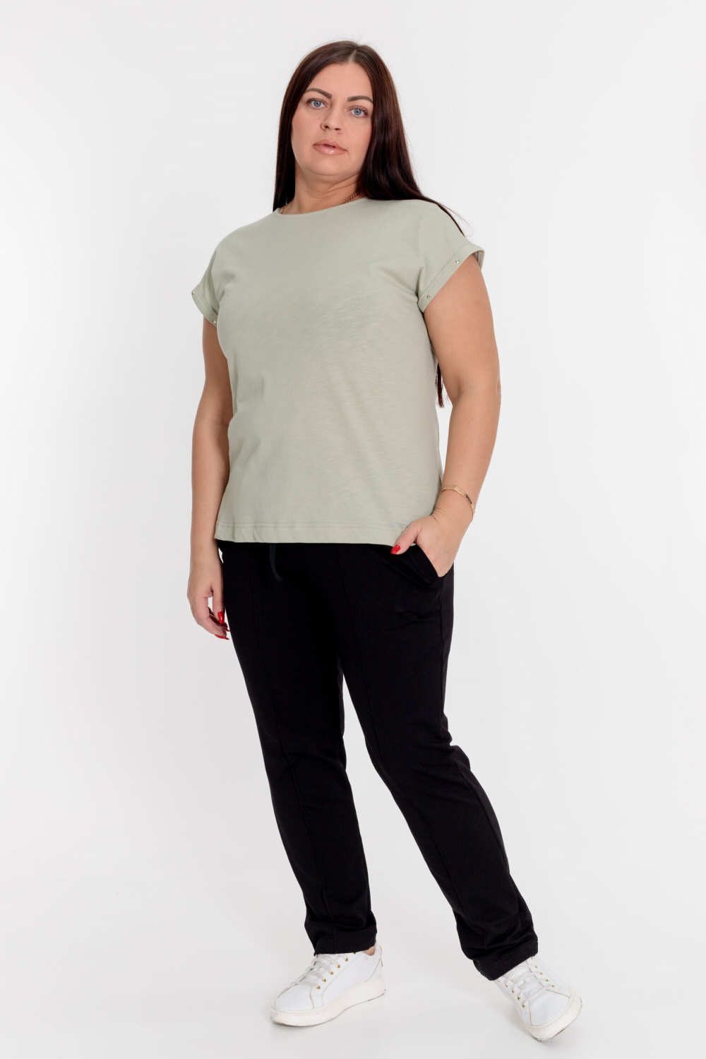 Футболка выполнена из однотонного полотна кулирка фламли. Горловина с круглым вырезом, короткие цельнокроеные рукава с отворотами, украшенными металлическими хольнитенами. Внизу, спереди нанесён принт.