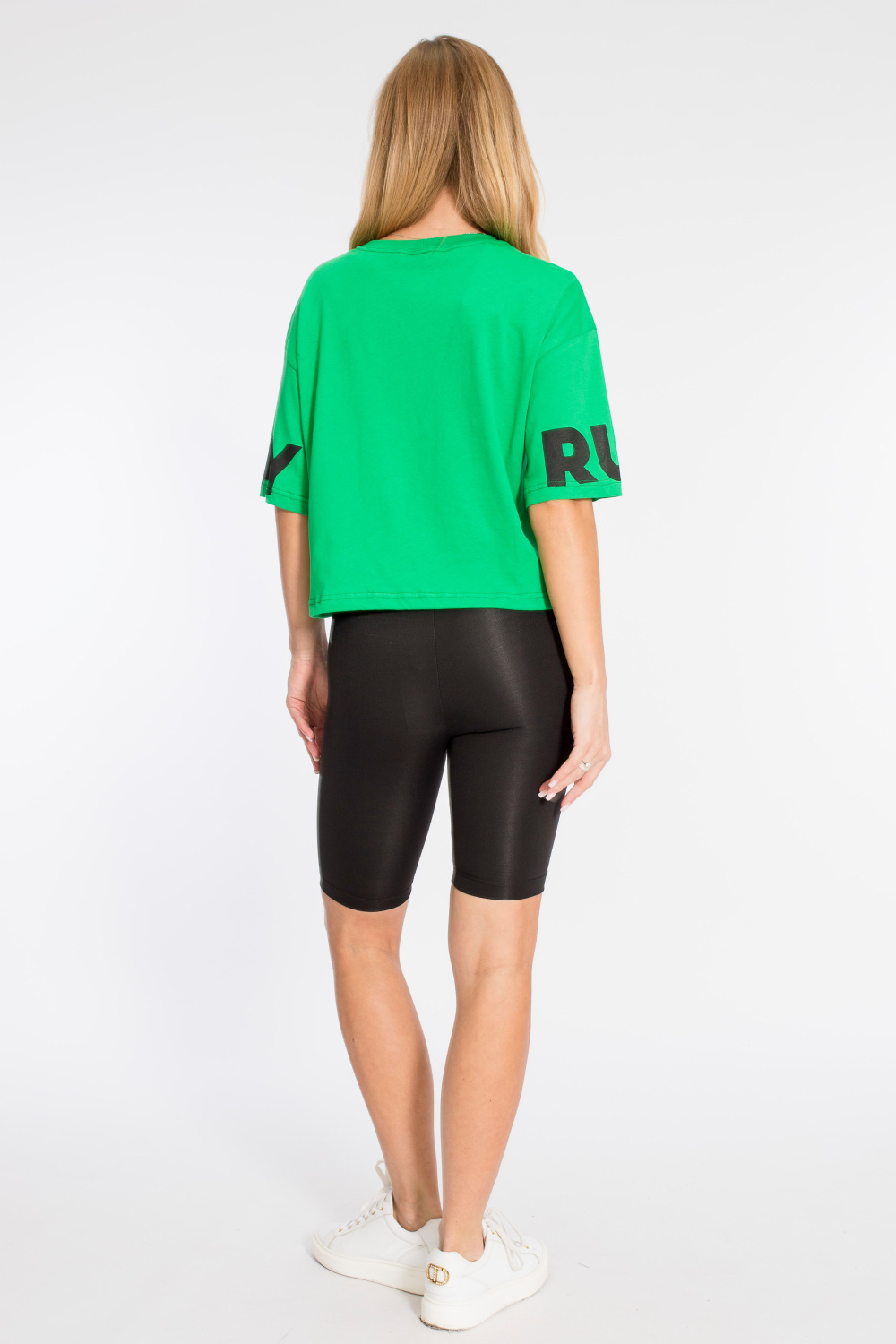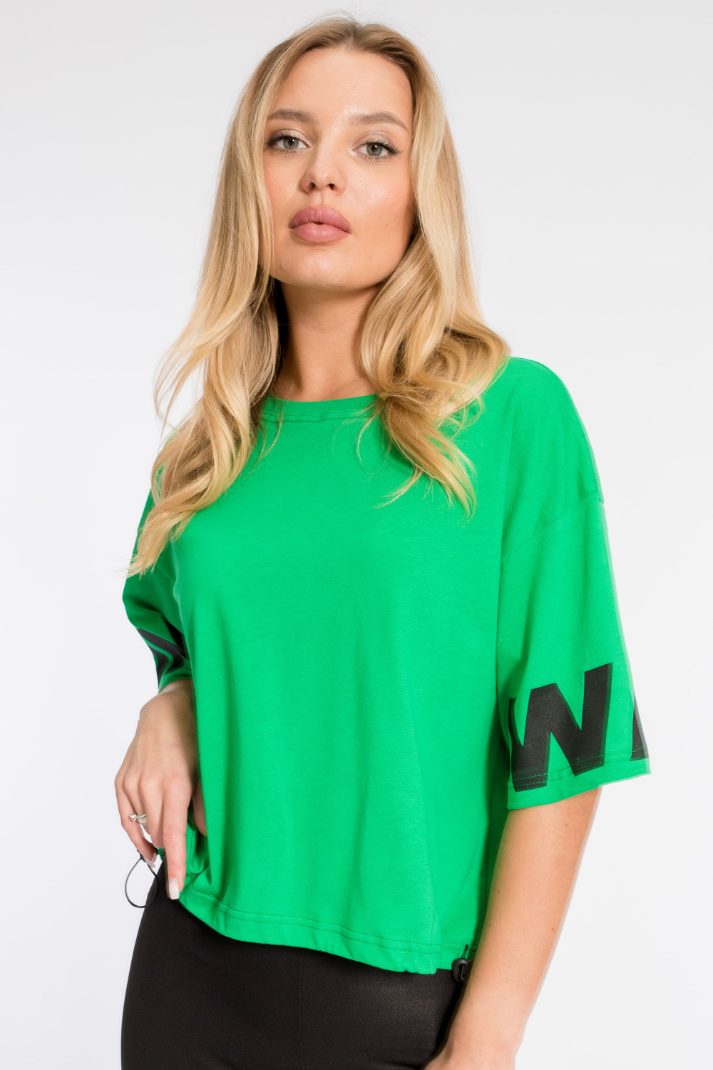 Футболка укороченная, оверсайз силуэта, выполнена из однотонной кулирки. С коротким рукавом и круглым вырезом горловины. По низу вставлен узкий шнур с фиксаторами. На рукавах нанесён принт.