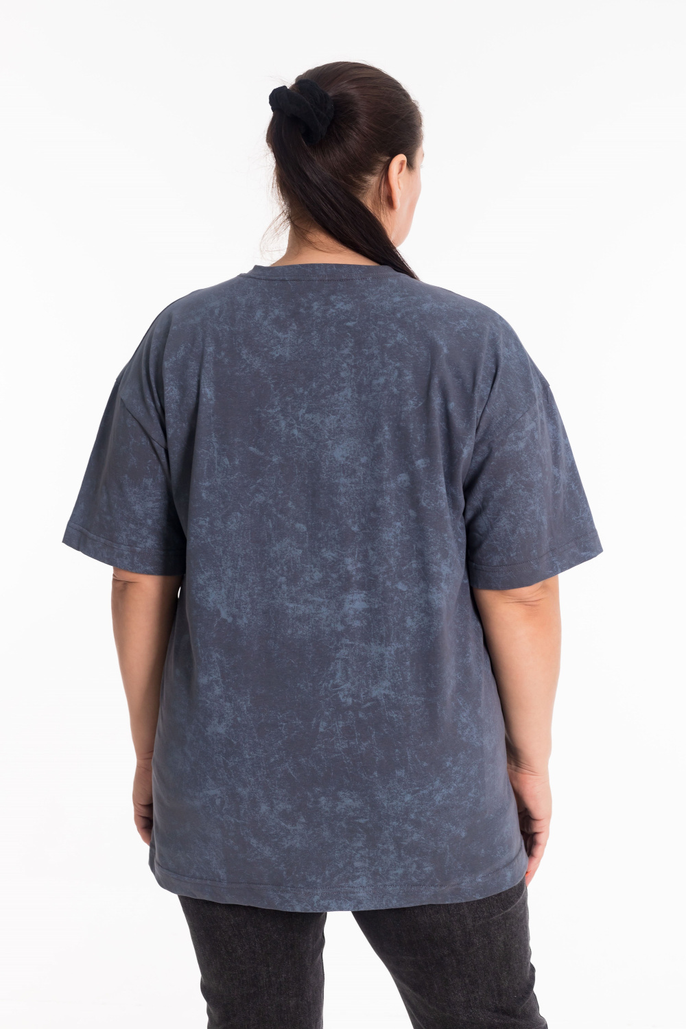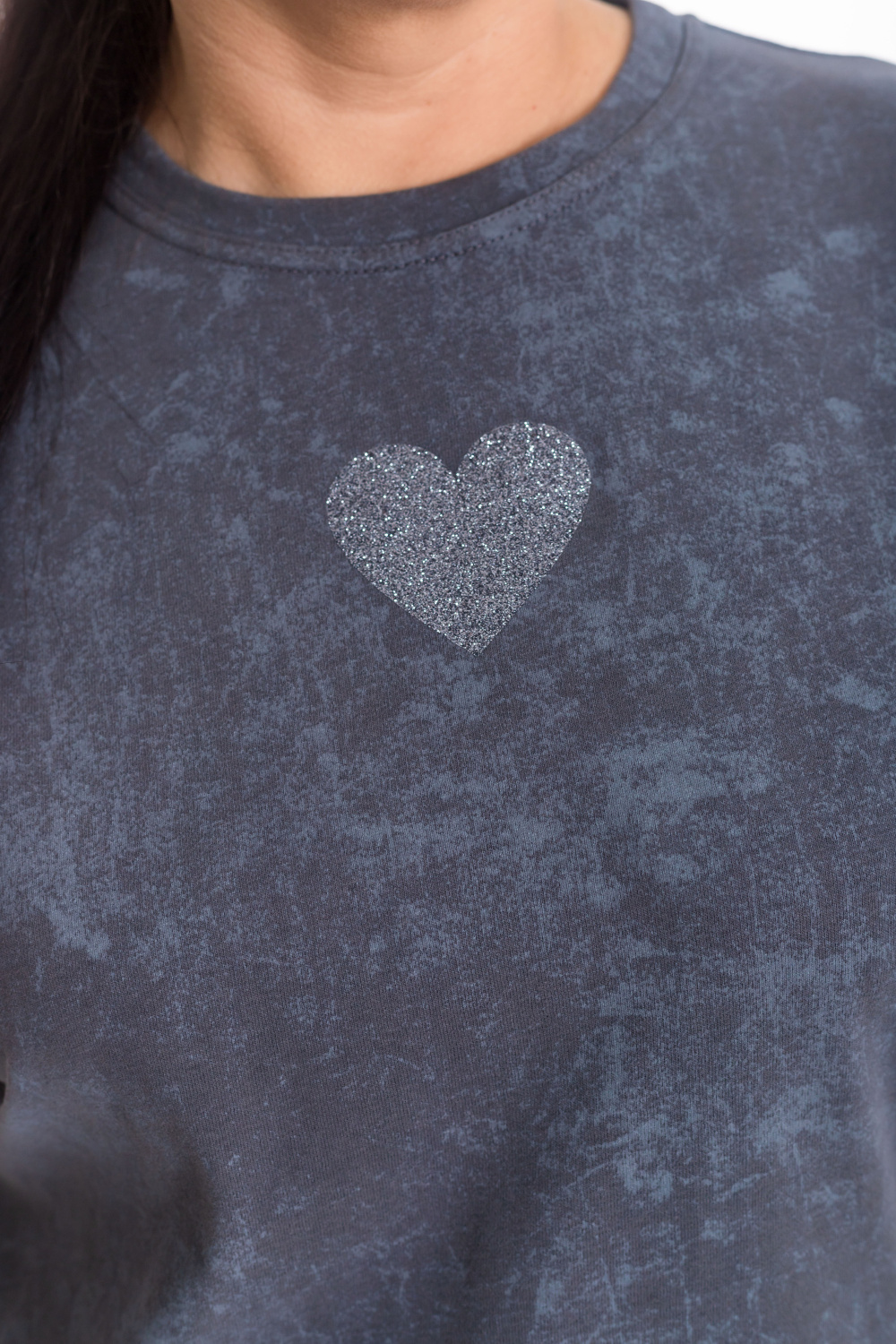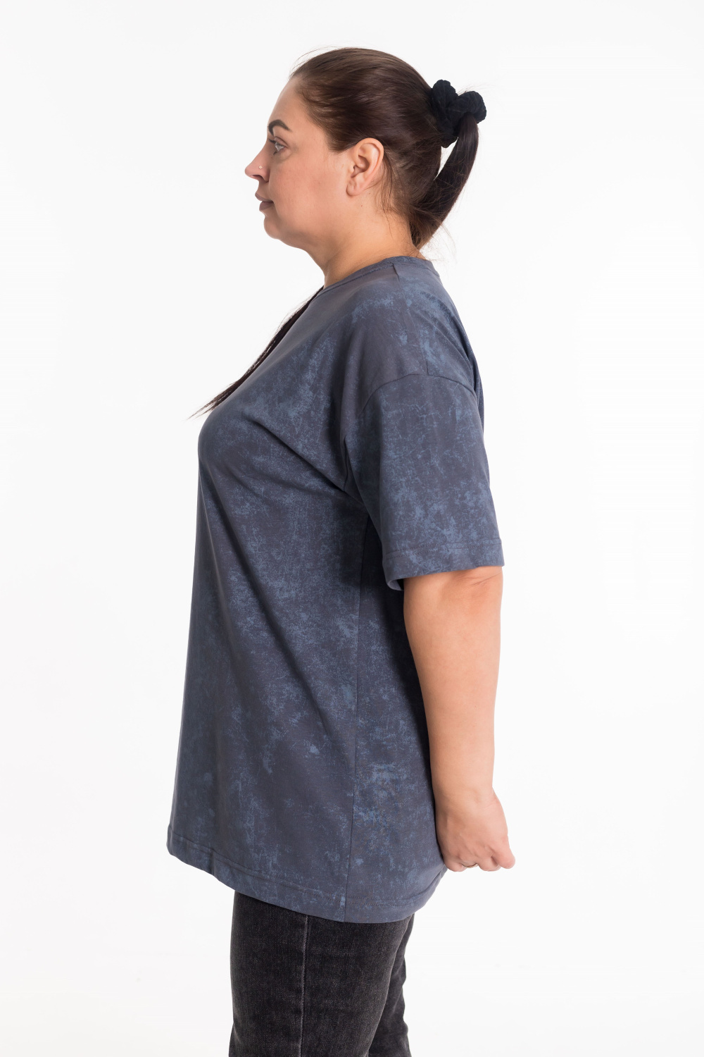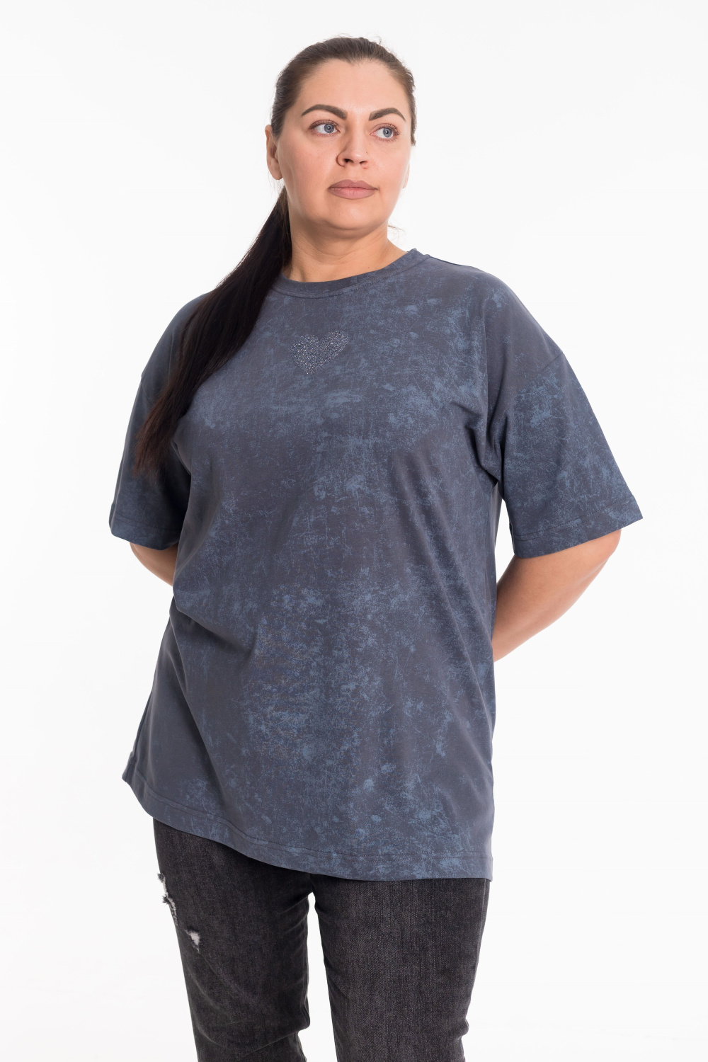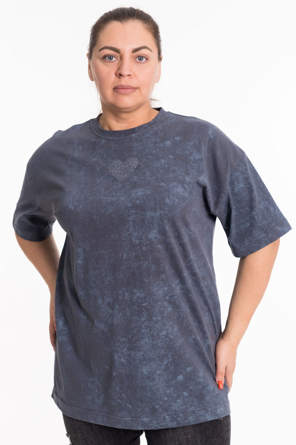 Женская футболка из лёгкой и приятной к телу ткани — отличный выбор для повседневного гардероба. Изготовлена из кулирки серого цвета, имеет свободный силуэт и круглый вырез горловины. Принт на полочке добавляет изделию оригинальность. Футболка идеально подойдёт для отдыха или домашней носки.