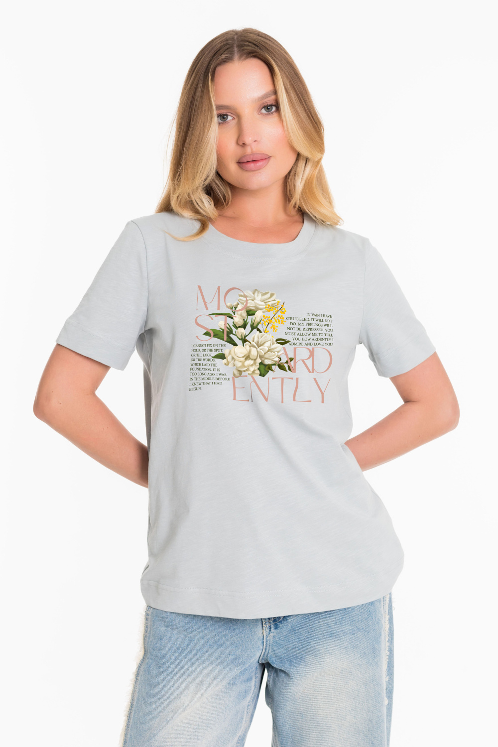 Женская футболка с принтом изготовлена из хлопкового полотна - кулирка "фламли", что обеспечивает комфорт и хорошую воздухопроницаемость. Футболка имеет короткий рукав и круглый вырез горловины, что придает ей классический стильный вид. Такая модель футболки отлично сочетается с джинсами, брюками или юбкой. Изготовленная из натуральной ткани, футболка обеспечит комфорт в течение всего дня.