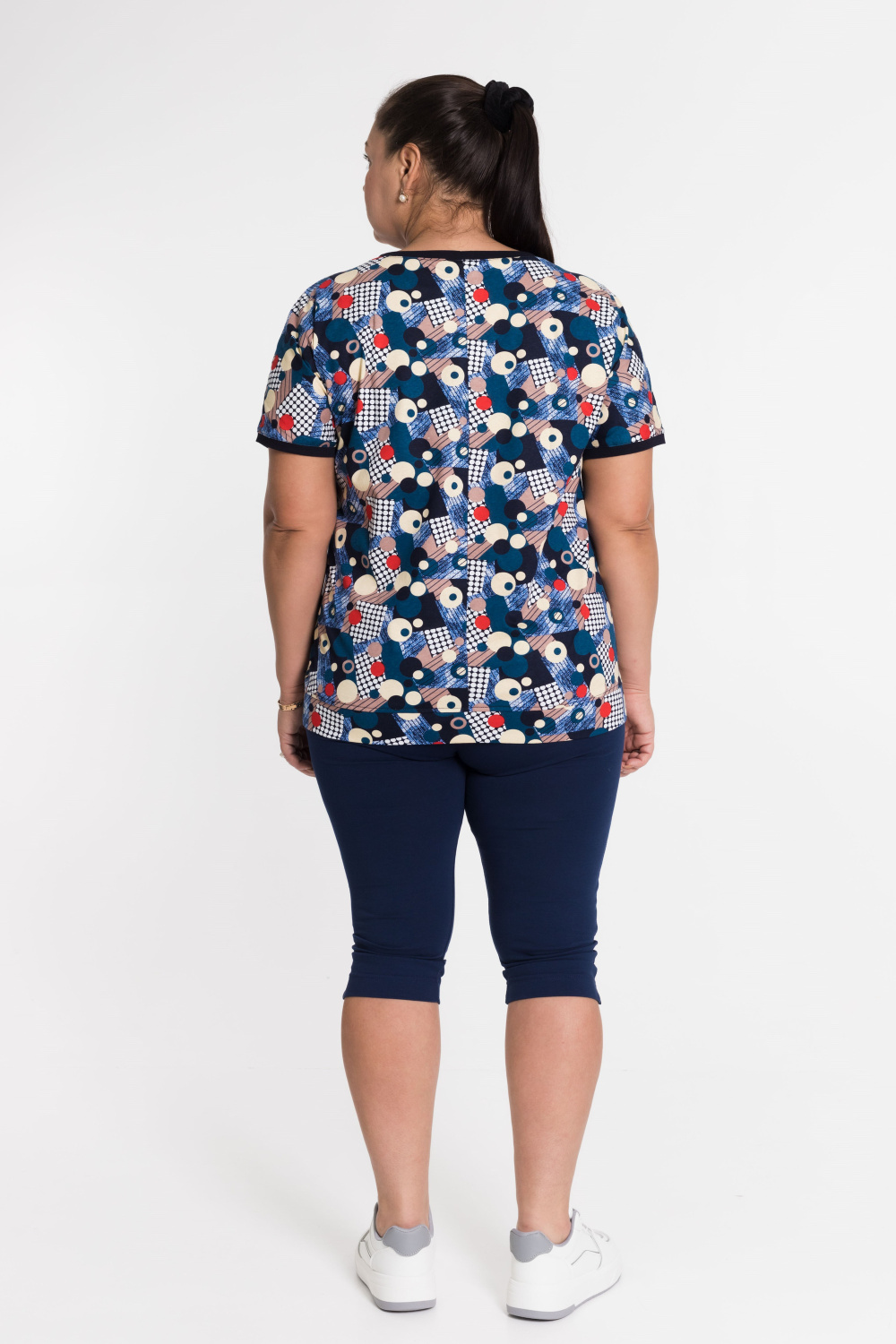 Футболка выполнена из х/б полотна с набивным рисунком. Силуэт свободный, вырез горловины округлый. Спереди размещён нагрудный карман.