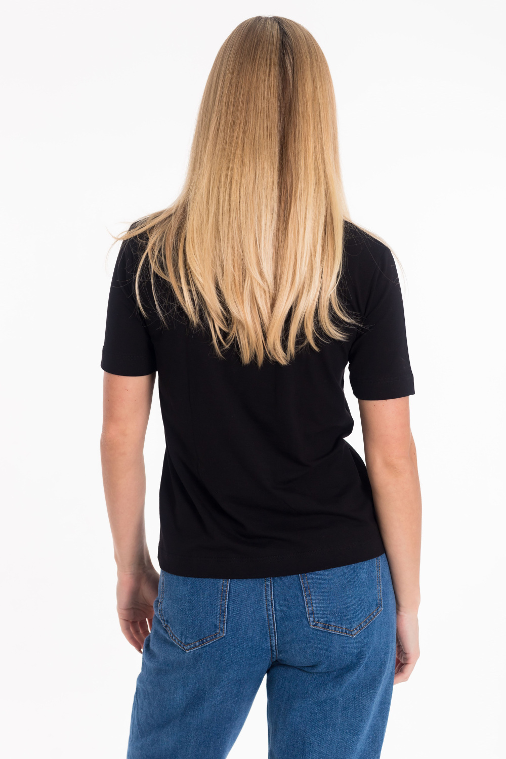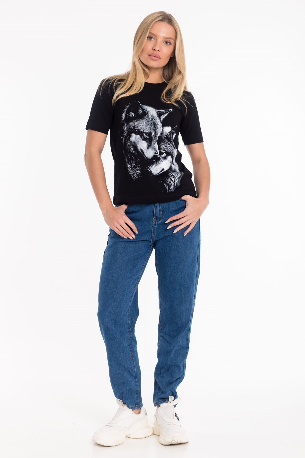 Женская футболка с принтом изготовлена из хлопкового полотна с добавлением лайкры, что обеспечивает комфорт и хорошую воздухопроницаемость. Футболка имеет короткий рукав и круглый вырез горловины, что придает ей классический стильный вид. Такая модель футболки отлично сочетается с джинсами, брюками или юбкой. Изготовленная из натуральной ткани, футболка обеспечит комфорт в течение всего дня.