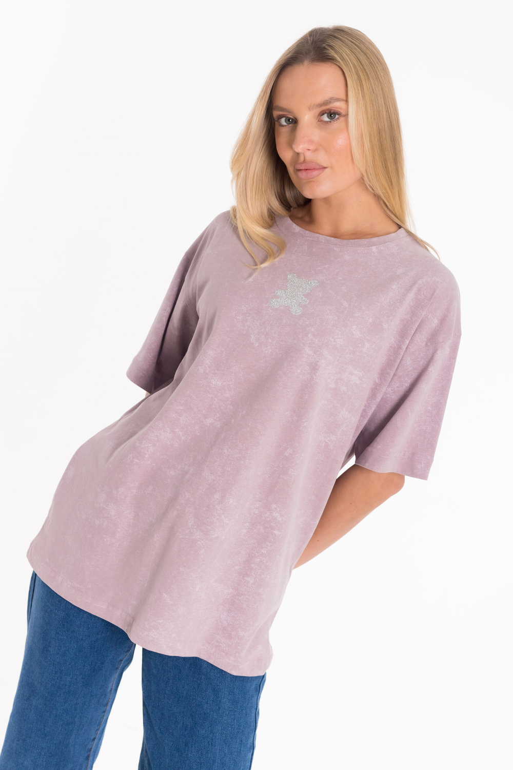 Женская футболка из лёгкой и приятной к телу ткани — отличный выбор для повседневного гардероба. Изготовлена из однотонной кулирки розового цвета, имеет свободный силуэт и круглый вырез горловины. Принт на полочке добавляет изделию оригинальность. Футболка идеально подойдёт для отдыха или домашней носки.