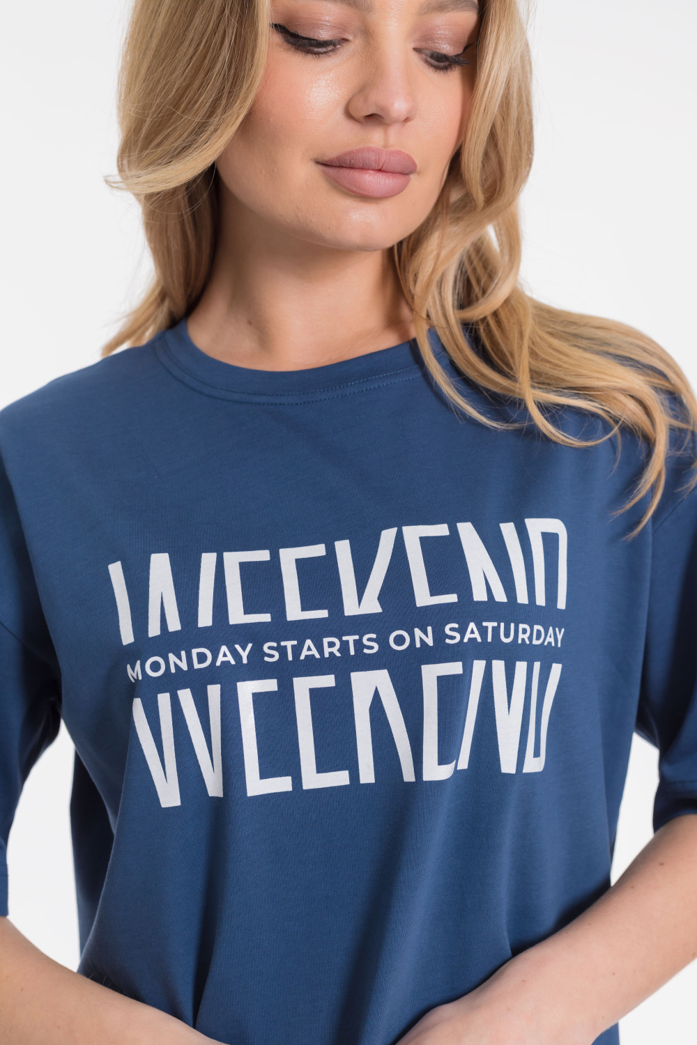 Футболка оверсайз силуэта из однотонной кулирки, 100% хлопок. С коротким рукавом и круглым вырезом горловины, оформленным планкой. Спереди нанесён принт.