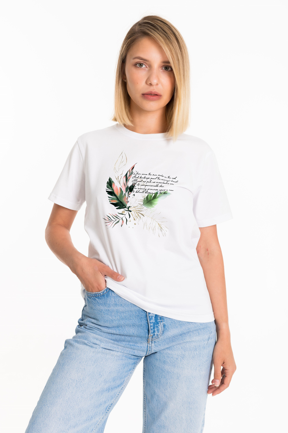 Женская футболка с принтом спереди изготовлена из хлопкового полотна с добавлением лайкры. Футболка с коротким втачным рукавом и круглым вырезом горловины, что придает ей классический стильный вид. Такая модель футболки отлично сочетается с джинсами, брюками или юбкой. Изготовленная из натуральной ткани, футболка обеспечит комфорт в течение всего дня.