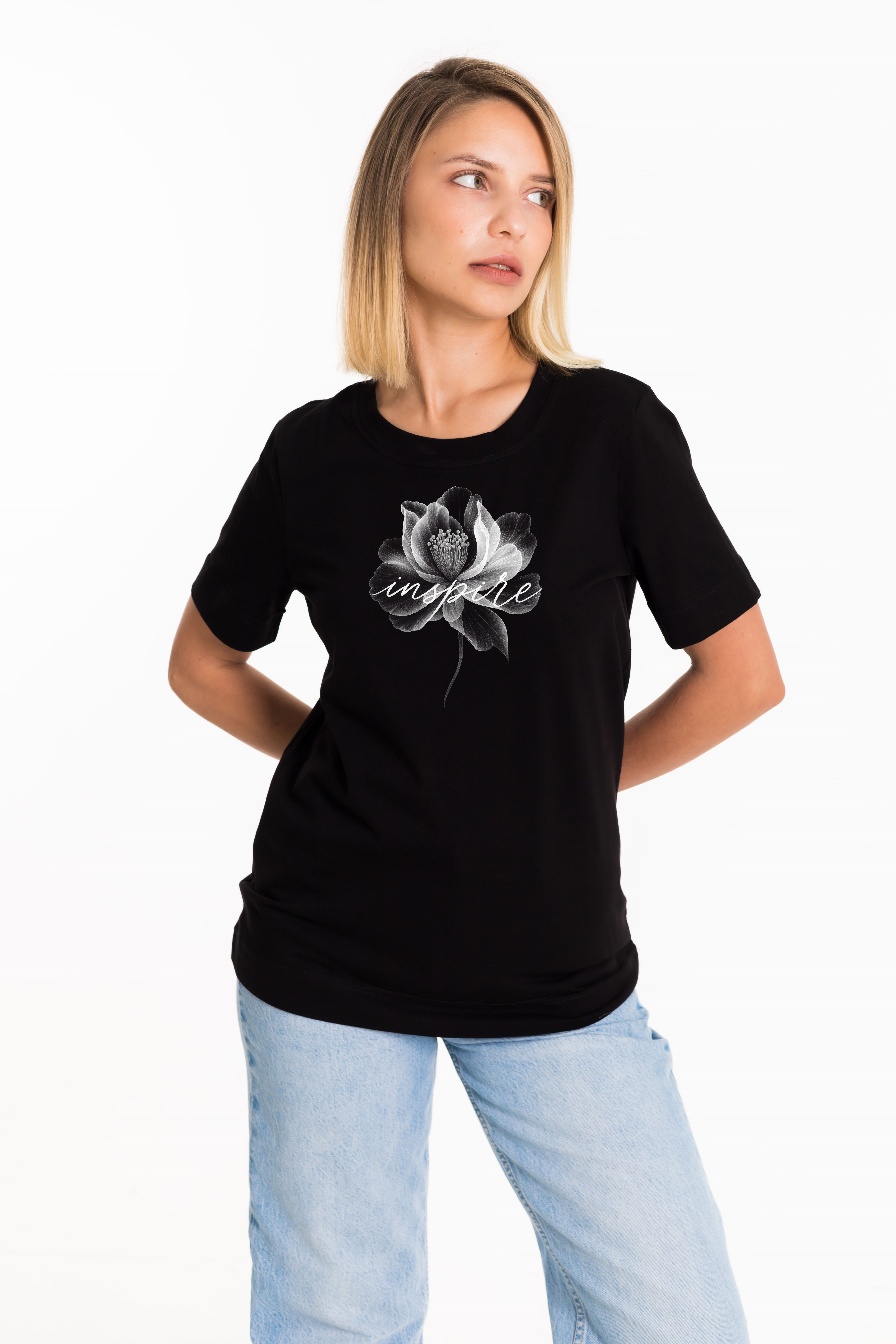 Футболка из однотонной кулирки, 100% хлопок. С коротким втачным рукавом и притачной планкой по горловине. Спереди нанесён принт.