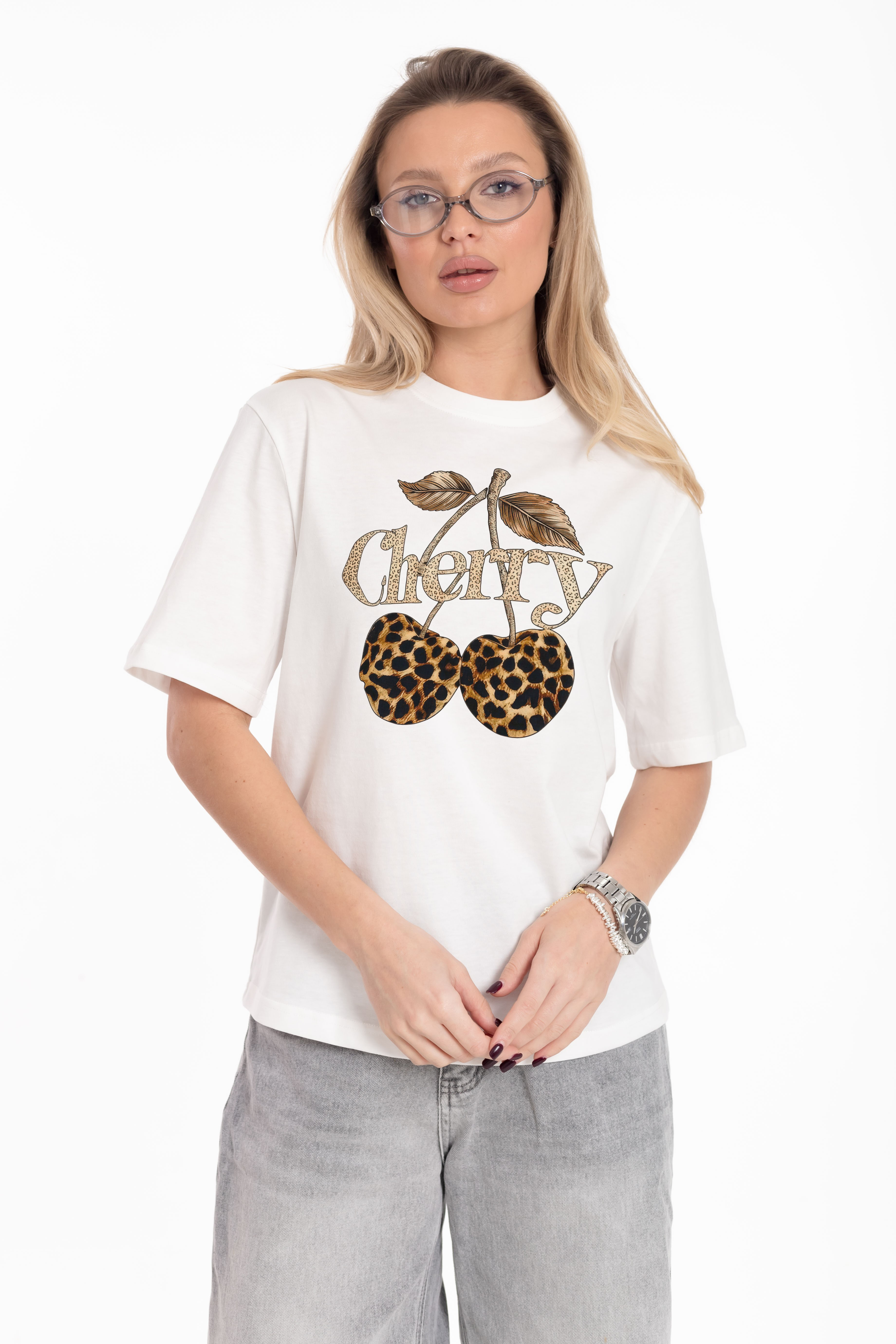 Футболка из однотонной кулирки, 100% хлопок. С коротким втачным рукавом и притачной планкой по горловине. Спереди нанесён принт.